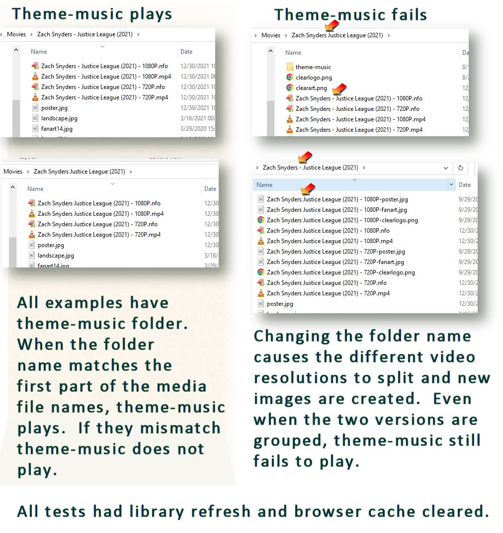 visproduction 315 Posted August 25, 2022 Author Posted August 25, 2022 Theme-music fails Folder: John Smith War and Peace (1949) Media file name: John Smith - War and Peace (1949) - 1080P (Extra dash after John Smith) Sub folder: theme-music: Media File name: Music from War and Peace.mp3 === Theme-music works: Just change media file name to match foloder name with no extra dash after John Smith: Folder: John Smith War and Peace (1949) Media file name: John Smith War and Peace (1949) - 1080P Sub folder: theme-music Nothing is changed, the file name is the same: Music from War and Peace.mp3 You have to manually change the media file name to cause this error. If you let Ebmy pull from the media name, I think it works. If you have two dashes in a name, then the pull down choices are no longer just 720P and 1080P. That is what caused me to edit the file names. Only Media name - 1080P and Media name - 720P results in seeing only 1080P and 720P in the pull down selection on the media page. Obviously this is an edge case and probably can be ignored.