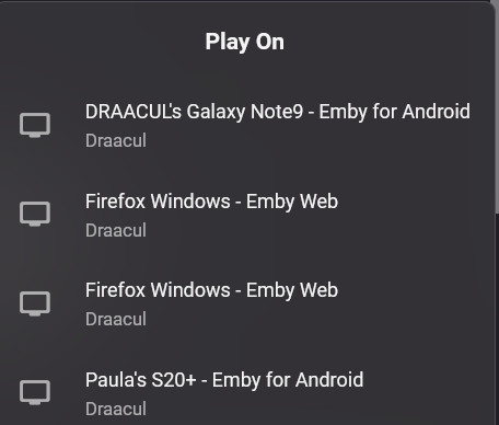 draacul 1 Posted September 9, 2022 Posted September 9, 2022 first off.. Emby Rules the universe. That being said, when i go to play on another computer using the "play on another device" menu..I can't tell which computer to play to. (iscreenshot attached) I can see phone names, and I used to be able to see computer names. I dont know what I changed. I use a mix of Emby Theator, pc client, the android app, and Firefox web client. how do i change this or set a name? I only have one user for multiple computers. Thanks