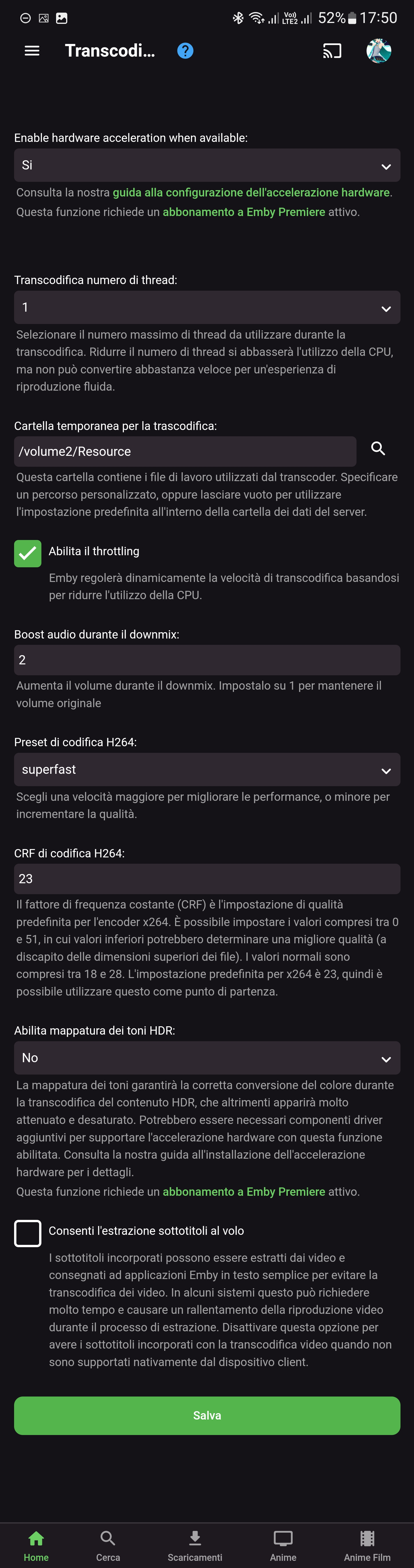 loripod 2 Posted September 29, 2022 Author Posted September 29, 2022 Hi ebr! sorry i forgot to restore permission transcoding on that account. I do the test, log attached. ffmpeg-transcode-d0e729d1-052e-474e-b371-cbc9efbf54c8_1.txt ffmpeg-transcode-9cc48652-9fbc-43ea-b240-81f6fabc50be_1.txt ffmpeg-transcode-0765ea05-ceff-4708-bbc3-0263bcee50cd_1.txt ffmpeg-transcode-08a26e10-aef3-485b-a18c-d3f7693e165b_1.txt embyserver trasconding success.log