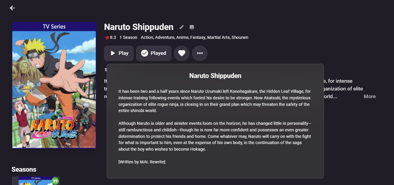HeroLeam 11 Posted September 28, 2022 Author Posted September 28, 2022 9 hours ago, Happy2Play said: Plugin update resolved image issue. But honestly do not know what metadata comes from this provider. 2022-09-27 18:06:47.956 Debug App: Running MyAnimeListSeriesImageProvider for C:\Users\Media\Desktop\Videos\Unset\Naruto Shippūden 2022-09-27 18:06:47.956 Info HttpClient: GET https://myanimelist.net/anime/1735 2022-09-27 18:06:48.671 Info HttpClient: GET https://cdn.myanimelist.net/images/anime/1565/111305.jpg 2022-09-27 18:06:48.693 Debug ProviderManager: Saving image to C:\Users\Media\Desktop\Videos\Unset\Naruto Shippūden\folder.jpg yes, the image is now fetching, but the metadata is fetching from somewhere else, because the title and synopsis is coming different from what is in myanimelist...