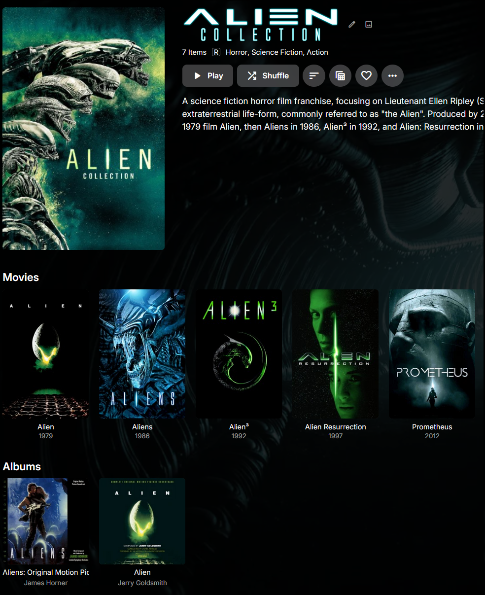 stephen_hill 46 Posted September 27, 2022 Posted September 27, 2022 Hi I would like to request that, when viewing a collection, Emby groups items in the collection by their library type (Movie, TV Show, Music etc). Currently all members in a collection are mixed together under one heading labeled "Items", as shown here: Here is a mock-up of how I think it would look: As you can see above, the Alien Collection has both movies and sounds tracks, and so I think they should be grouped together. Many Thanks Stephen 5 3