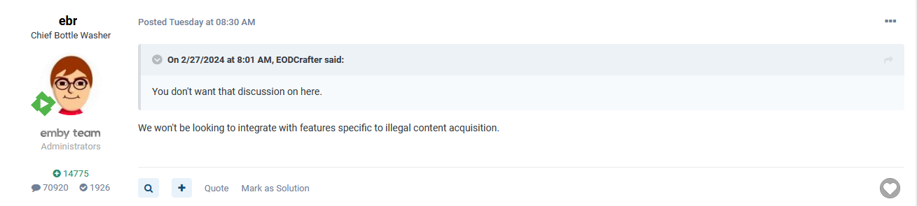 EODCrafter 181 Posted February 29, 2024 Author Posted February 29, 2024 (edited) In response to @ebr, I did nothing illegal, Emby is for Personal use. Edited February 29, 2024 by EODCrafter 1