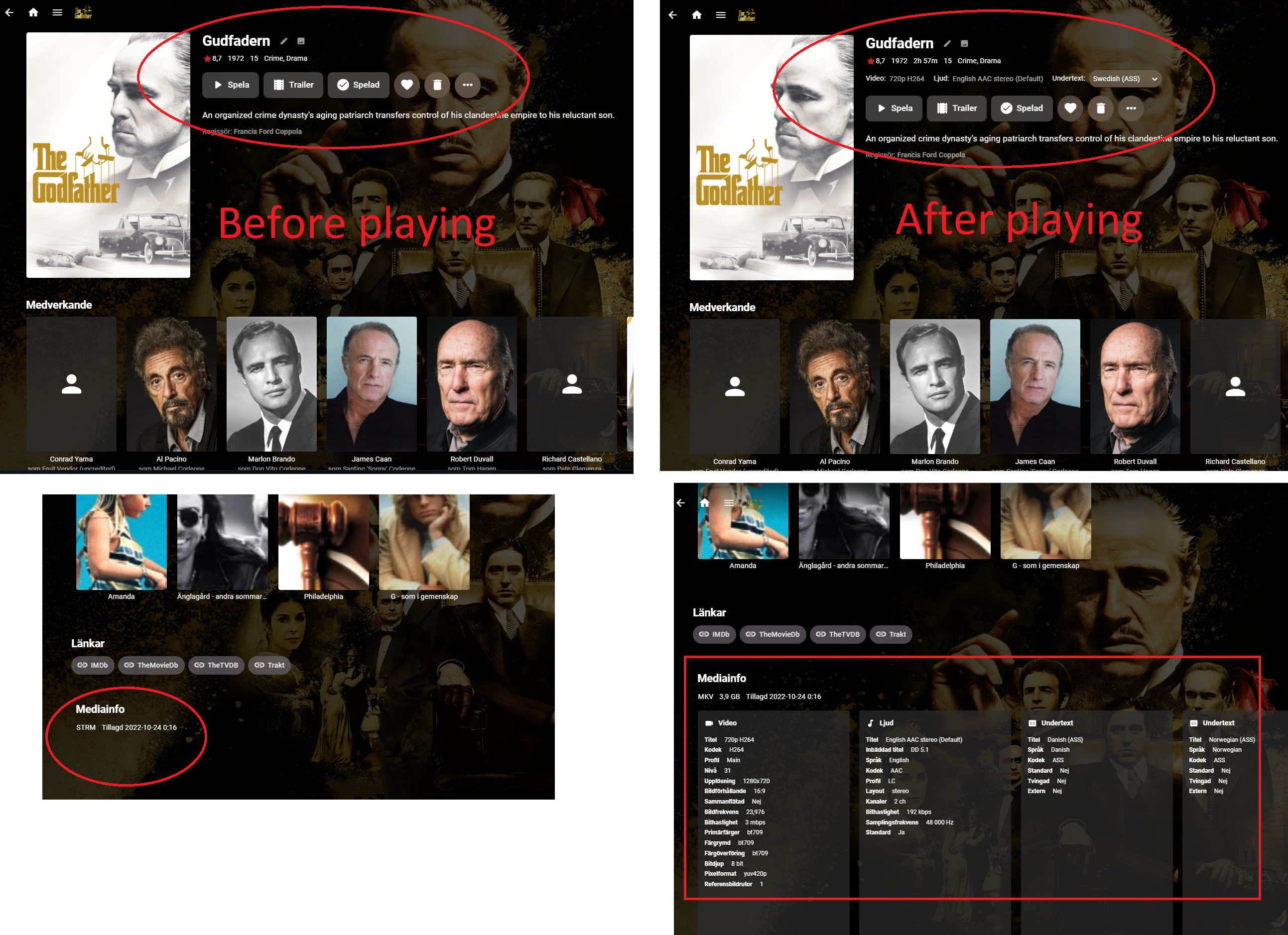 chef 3810 Posted November 12, 2022 Author Posted November 12, 2022 (edited) 31 minutes ago, h.soderlund said: Hello again! I can't get the top picks to populate... Some background: My library is built up using ".strm" files. I get this from my iptv provider and by running a script it scans a m3u file and create these streaming files into one movie folder and one tvshow folder. Emby then scan these directories and my library is populated with metadata of all the content. Before watching a movie/show emby only picks up thats it is a stream, and nothing more. After playing the movie for just a second and the cancel, all the media info is available. See below picture. The issue: So, the problem is that the Top Picks addon do not populate a list. I have no idéa if it has to do with the above information, but thats my best guess. However, i can make a list manually by choosing items from both movies and tv-shows, and i is displayed correctly. All movies and tv-shows is available when creating this list. (See attached image). Movie library is some 8000 movies, and tv-show is somewhere around 2000, so there is a lot of content for top picks to use. This is the only output i get from the log when "calculating user engagement", and update top picks takes less than a second to finish with no result. 2022-11-12 12:43:03.872 Info Server: http/1.1 POST http://192.168.1.81:55242/emby/ScheduledTasks/Running/5398ea6da30ecb83be7152e61dd217e6?X-Emby-Client=Emby Web&X-Emby-Device-Name=Chrome Windows&X-Emby-Device-Id=ff1d7027-6f62-487f-9783-be6271f785fc&X-Emby-Client-Version=4.8.0.16. UserAgent: Mozilla/5.0 (Windows NT 10.0; Win64; x64) AppleWebKit/537.36 (KHTML, like Gecko) Chrome/107.0.0.0 Safari/537.36 2022-11-12 12:43:03.876 Info Server: http/1.1 Response 204 to host1. Time: 4ms. http://192.168.1.81:55242/emby/ScheduledTasks/Running/5398ea6da30ecb83be7152e61dd217e6?X-Emby-Client=Emby Web&X-Emby-Device-Name=Chrome Windows&X-Emby-Device-Id=ff1d7027-6f62-487f-9783-be6271f785fc&X-Emby-Client-Version=4.8.0.16 2022-11-12 12:43:04.185 Info Top Picks: Library Items contains 0 Items... 2022-11-12 12:43:04.185 Info Top Picks: User Items contains 4... Thanks in advance! hi @h.soderlund Thanks for posting. I am aware that the Media Info is not populated in the the library, until after the item is played. At the moment there isn't much I can do regarding this. Would it be possible to see an entire log from when you attempted to run the "UserEngagement" task?i It looks like the engagement task hasn't been able to find any items that match the criteria. This can happen. perhaps turning off "favor recently added items", and "favor new releases". I will take a look at the code, and try to populate a list if the engagement task isn't able to find items in the library at first so the list gets populated with something. Thanks again Edited November 12, 2022 by chef