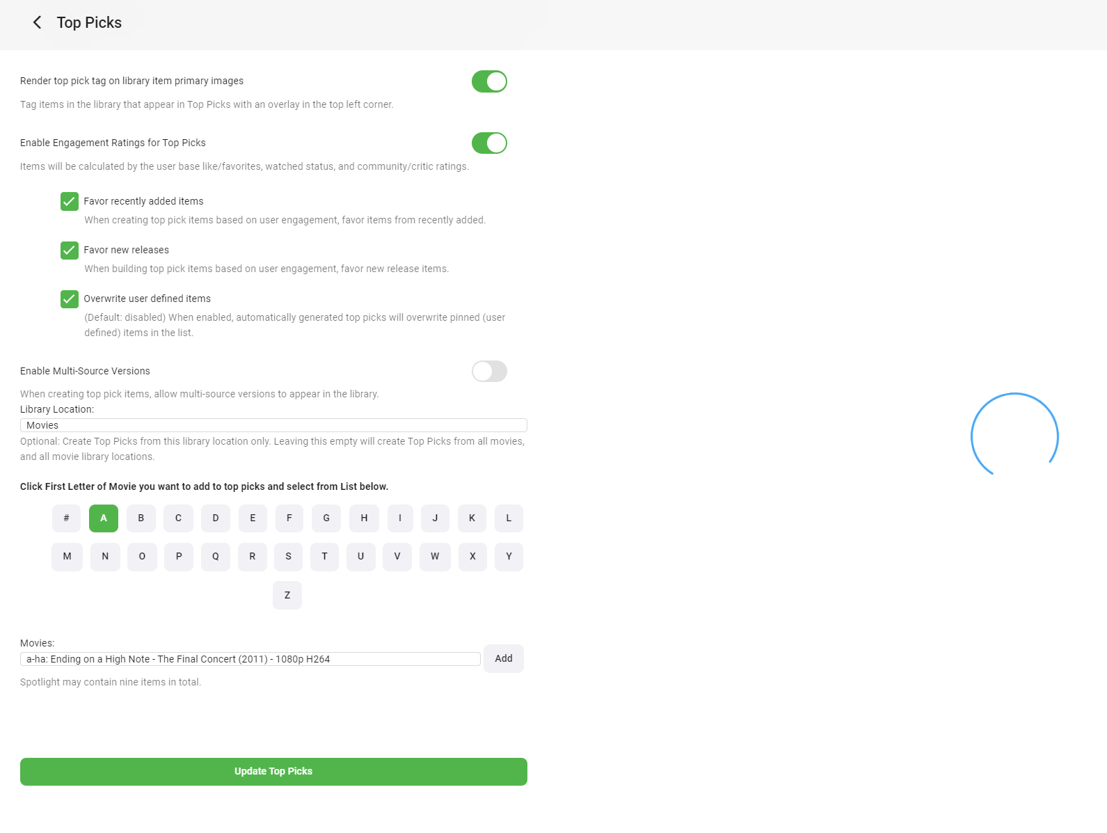 regorresiak 1 Posted February 12, 2024 Posted February 12, 2024 7 hours ago, chef said: I've pushed .57 to the catalog which will load top picks again. I have tested and it will work. It looks like it still needs some tending too though. Things have changed in the emby UI, so I'll have to get these fixed.  I uninstalled the original version, because it did not work after replacing the DLL you had posted and installed this latest version .57. Unfortunately, the plug in still does not work. When i open the setting for the plug in, it appears it is constantly trying to load something as there is a "loading circle" that never goes away while on the setting page.