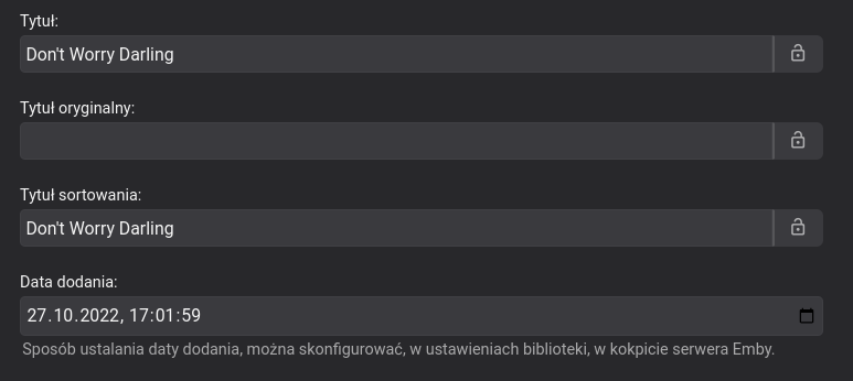 Przemek 70 Posted October 27, 2022 Author Posted October 27, 2022 3 hours ago, Luke said: Can you please provide a specific example? Thanks. This movie was added to my Emby yesterday and date was from january. I manually change that date to 27.10.2022.