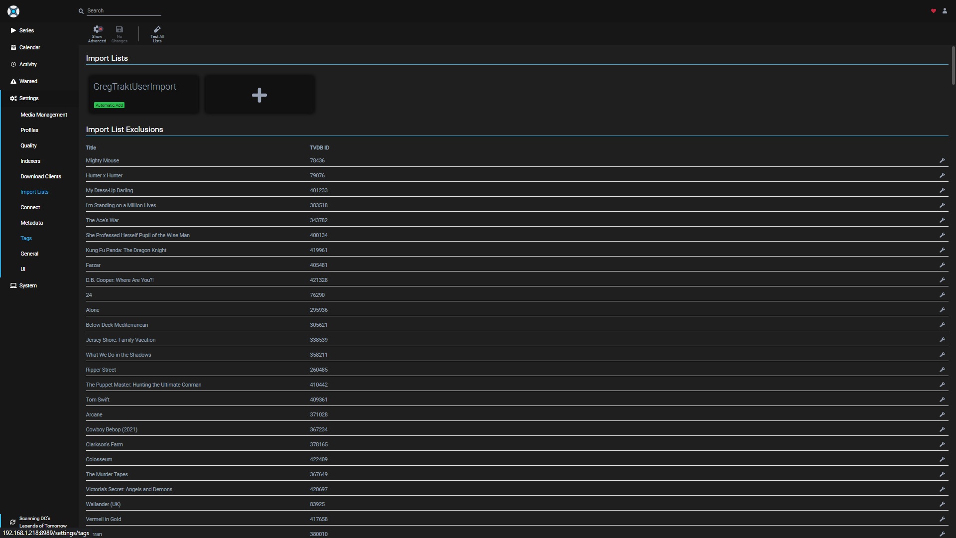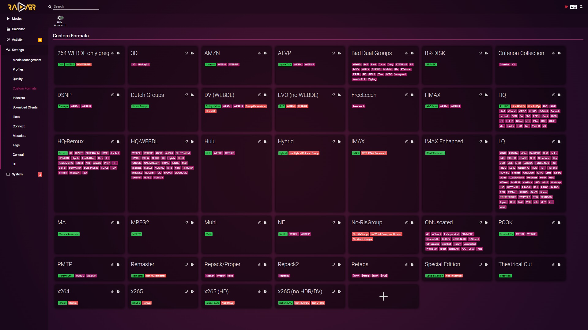 ryzen5000 17 Posted November 9, 2022 Author Posted November 9, 2022 (edited) I am using all the services I can think of. If there are anymore please tell me and I will order them. I am actually looking for a program that will properly put away and import my tv series into their respective folders but Medusa doesn't work properly all the time and Sonarr always gets the series name wrong on every one just during imports. If you look at the names of the series on the RH side during an import you will see. Every single one is wrong. 1. TrackTV https://trakt.tv/ $40 USD Year. This helps me chose which movies to grab, it connects automatically with Sonarr and Radarr to auto download from trending and popular lists. Right now I have it set to grab all the 2022 movies that come out and I leave radarr running 24/7 and I always find new movies in my download folder every morning. It makes less work for me because I do manually browse but I spend less time looking for and more time watching. 2. Radarr 3. Sonarr 4. Newsgroup Direct https://newsgroupdirect.com/ If you ask them they will send you their promotional page I paid $30 year unlimited 5. Eweka On a hidden promotional page https://www.eweka.nl/en/landing/special-usenet-deal for $2.99 month 5. Emby $178 6. Sabnzbd 185MB/s down. 7. Unraid 6.11.3 https://officerat.store/product/lime-technology-unraid-os-pro-6-10-3-server-os-software/ $25 subscription with lifetime updates. 8. Trash Guides https://trash-guides.info/ This helped me set custom formats and lists so I don't need to manually chose which movie file to download that has the best quality. It looks like the following when its all set up. 9. NZB GEEK https://nzbgeek.info/ $16 year Unlimited Edited November 9, 2022 by ryzen5000