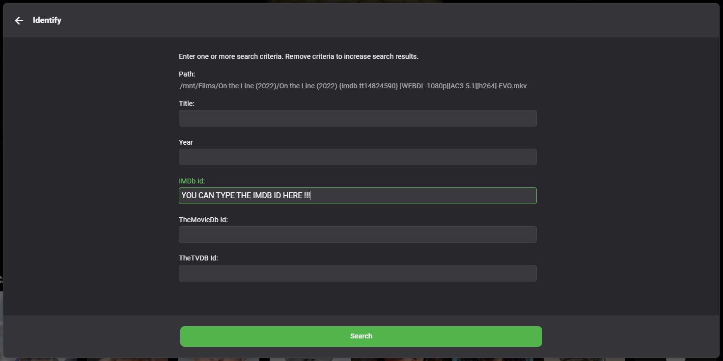 bonaminGR 21 Posted November 6, 2022 Posted November 6, 2022 (edited) 6 hours ago, ryzen5000 said: Wrong movie is displayed on EMBY How to correct? when I click identify it only gives the wrong option. When you Click on Identify, you can provide Emby with the Title of that movie, or if you REALLY want to be precise, you can provide the IMDb ID, or even IDs from TheMovieDB etc... here's a screenshot: In YOUR specific case, the IMDB ID for "On The Line (2022)" is "tt14824590". You can easily find the IMDB ID of any movie, by going to the movie's page on IMDB, and looking at the link on your browser. Example given: EDIT: Friendly Reminder ! (with respect) This post is on the wrong section. This isn't a Feature Request ! Edited November 6, 2022 by bonaminGR
