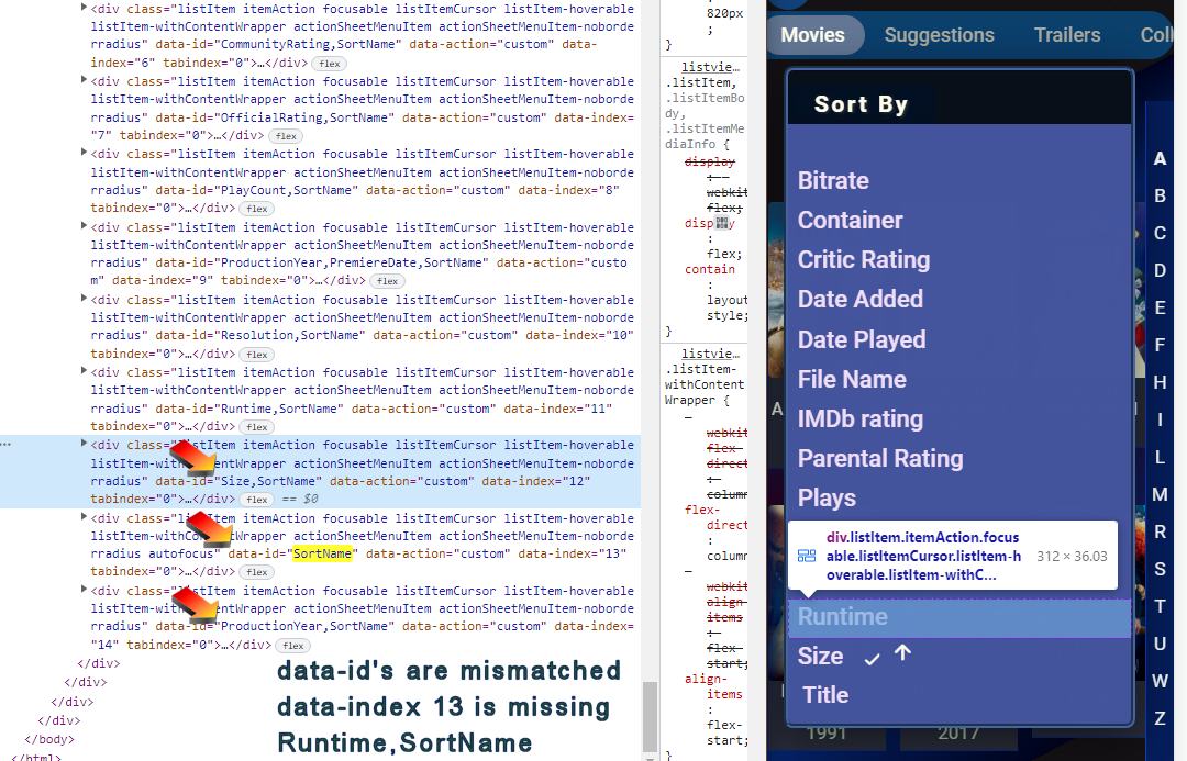 visproduction 316 Posted November 8, 2022 Posted November 8, 2022 (edited) Disregard. This was due to my code. The answer is further down. Read only for amusment. === Does anyone else see this bug? I can't test with a default install easily. Mobile - Web browser - Library - Sort order The checkmark is on the wrong row. This screenshot, Size is checked but Title sort is working. There is also a gap in the list at the top of the pull down menu. Is this code just incorrectly listing the sort titles? Did someone miss picking 0 as the first item in the Array? I don't think I have any custom.css that can create this issue, just some color style tweaks on this section. It's seems like it must be a dbase pull backend bug. Edited November 8, 2022 by visproduction