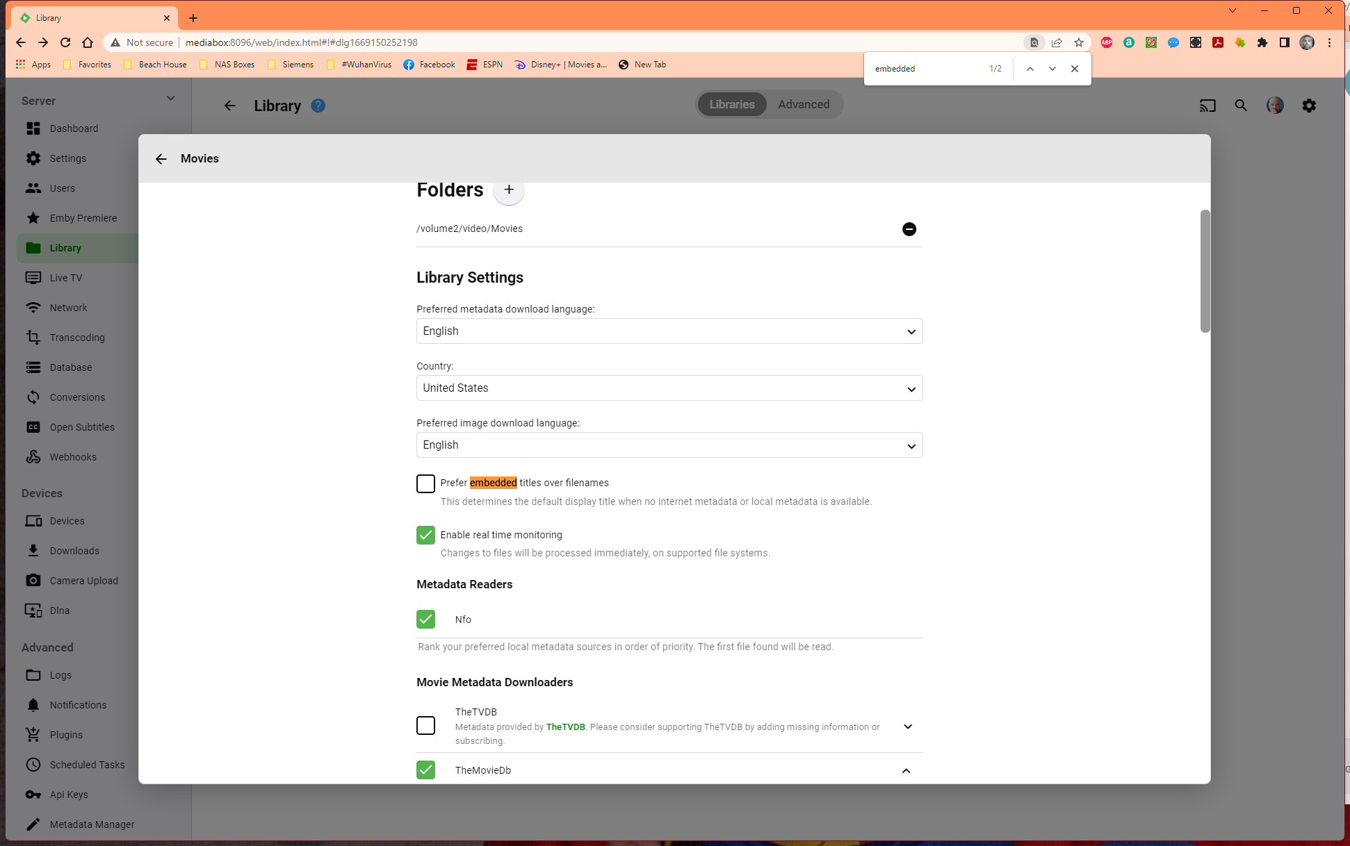 HawkXP71 112 Posted November 22, 2022 Author Posted November 22, 2022 24 minutes ago, Happy2Play said: What is your "Embedded track title display" setting? Settings-Library, advanced tab prefer embedded (but dependent on specific track titles) generate user friendly Emby does not support multiple video stream files. Its unchecked
