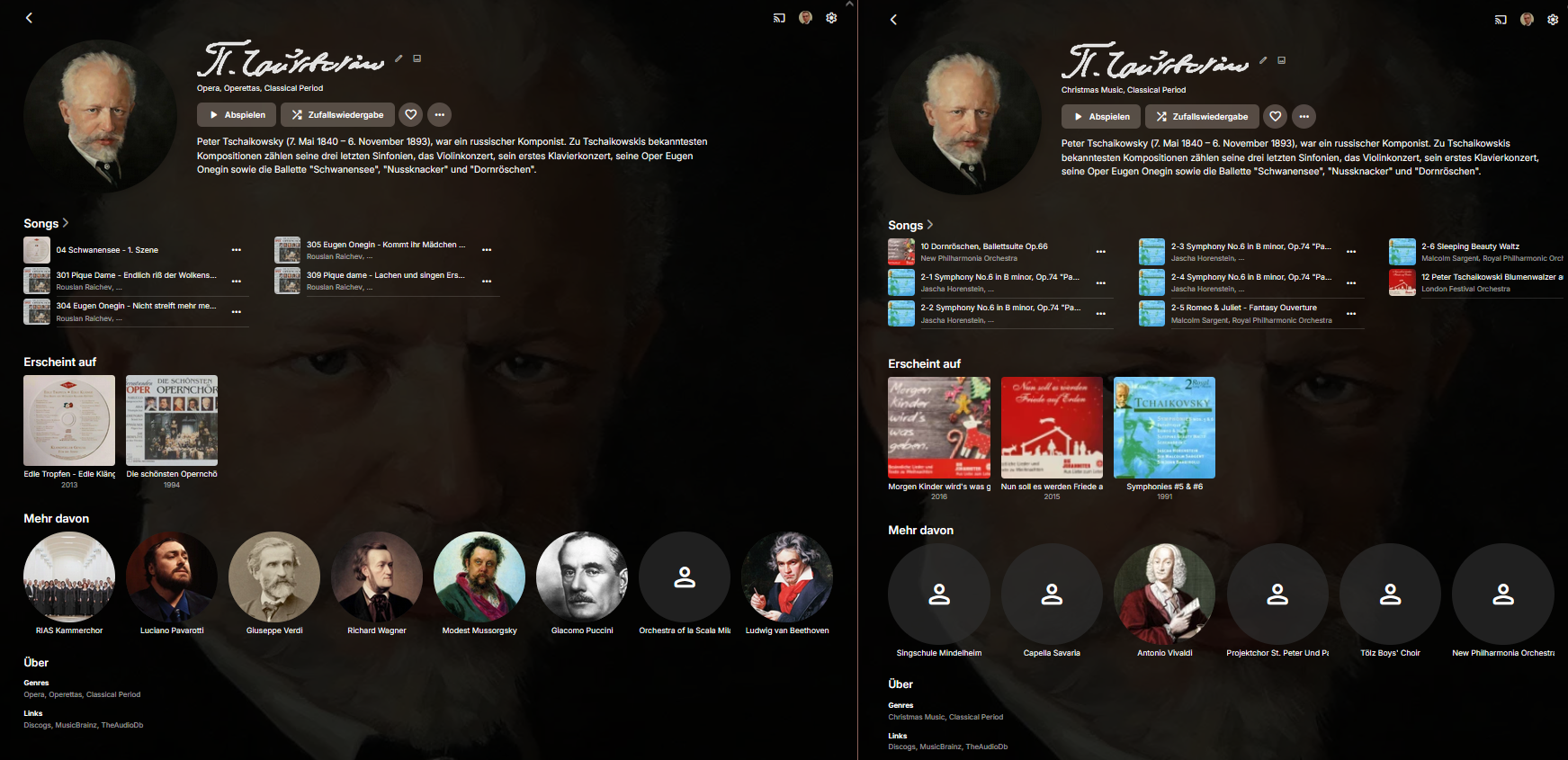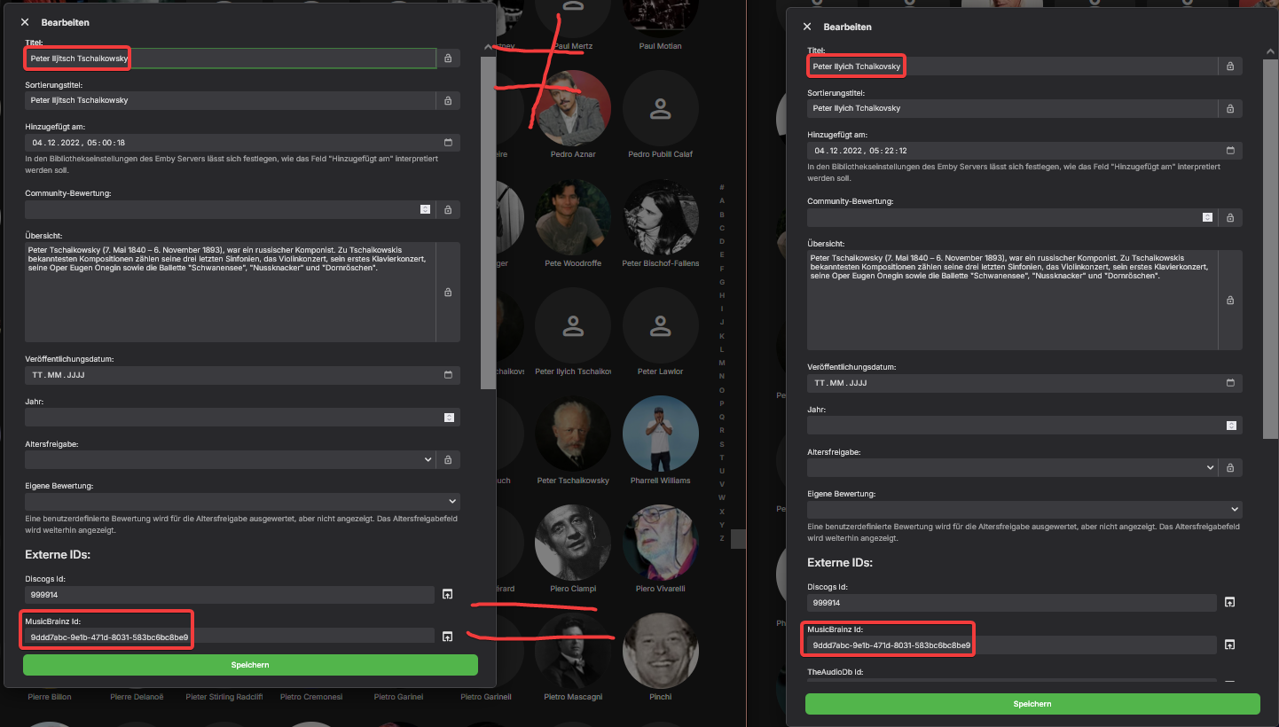 Charliexyx 7 Posted September 17, 2024 Author Posted September 17, 2024 On 09/01/2023 at 03:29, Luke said: There is a way to have it handled automatically, which is to have the tracks tagged with the same musicbrainz artist ids. This will join the artists even if the artist tag name differs. I can not confirm: I have tchaikovsky multiple times: when I edit them, they have identical ID: But the content shown on their page is not the same but unique to their specific spelled occurrence: Is it possible to merge those pages so that both show the links of both? Or merge them otherwise?