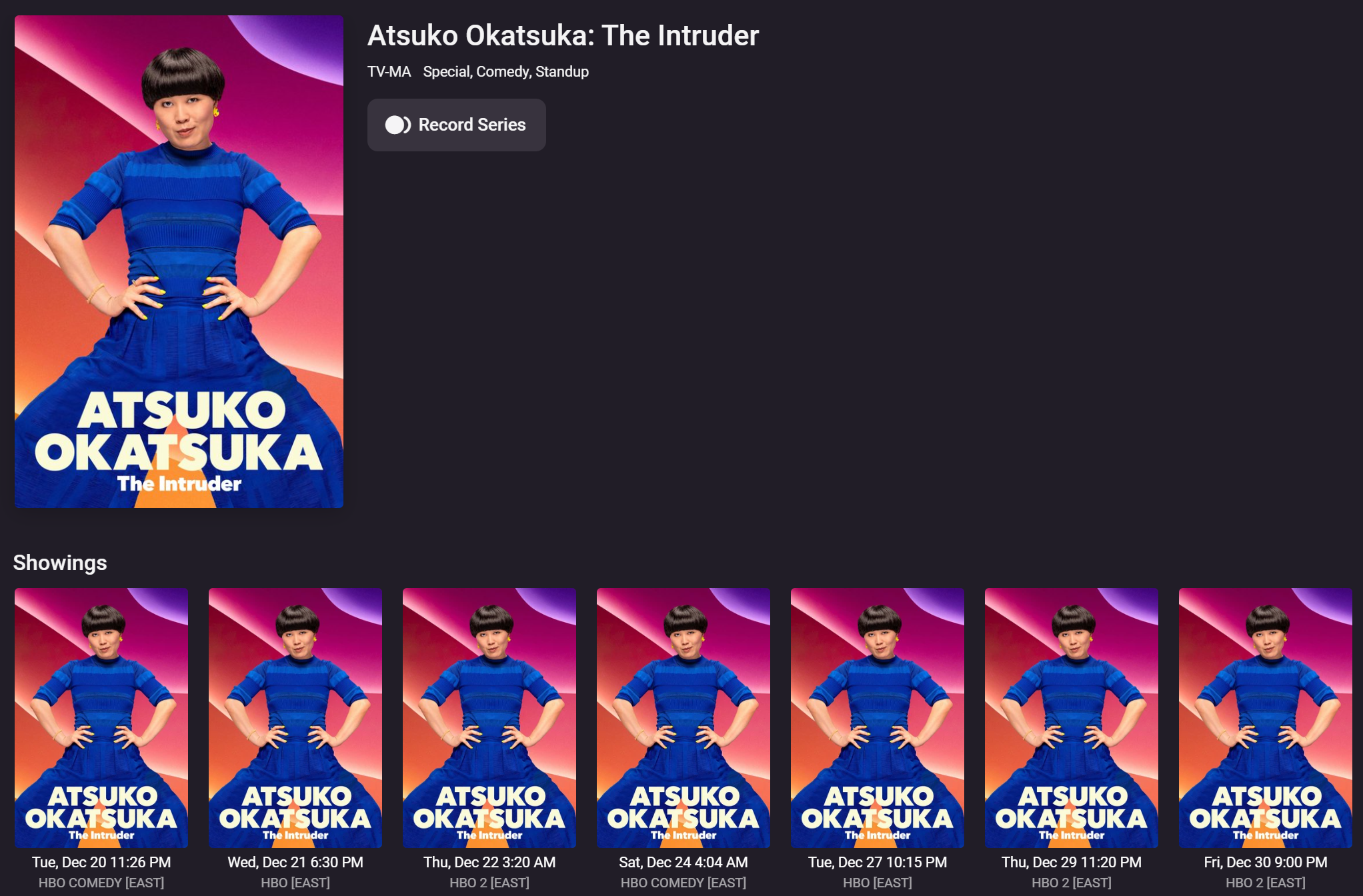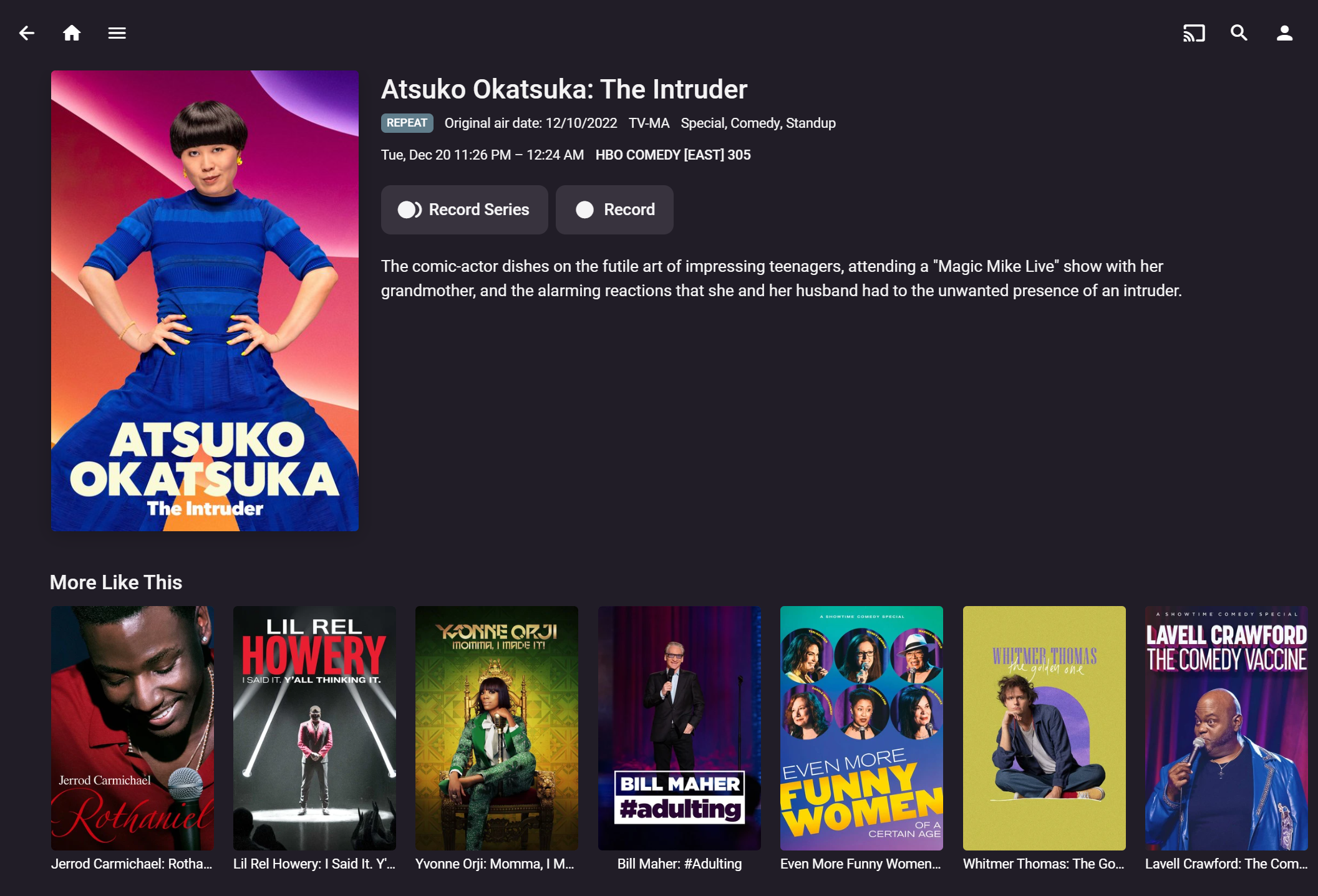 codechurn 9 Posted December 20, 2022 Author Posted December 20, 2022 How does one get into t he program detail view from the guide? If I click on the program in the guide I just get a popup with the choices below. If I click on the channel in the guide I get a list of all the programs and then I can select the program and see the detail view. It would be nice to just have that info i the pop-up from the guide. Also, the behavior for identifying other showings is inconsistent. Searching for a show I see this: However, if I go into one of those showings I do not see the other showings.