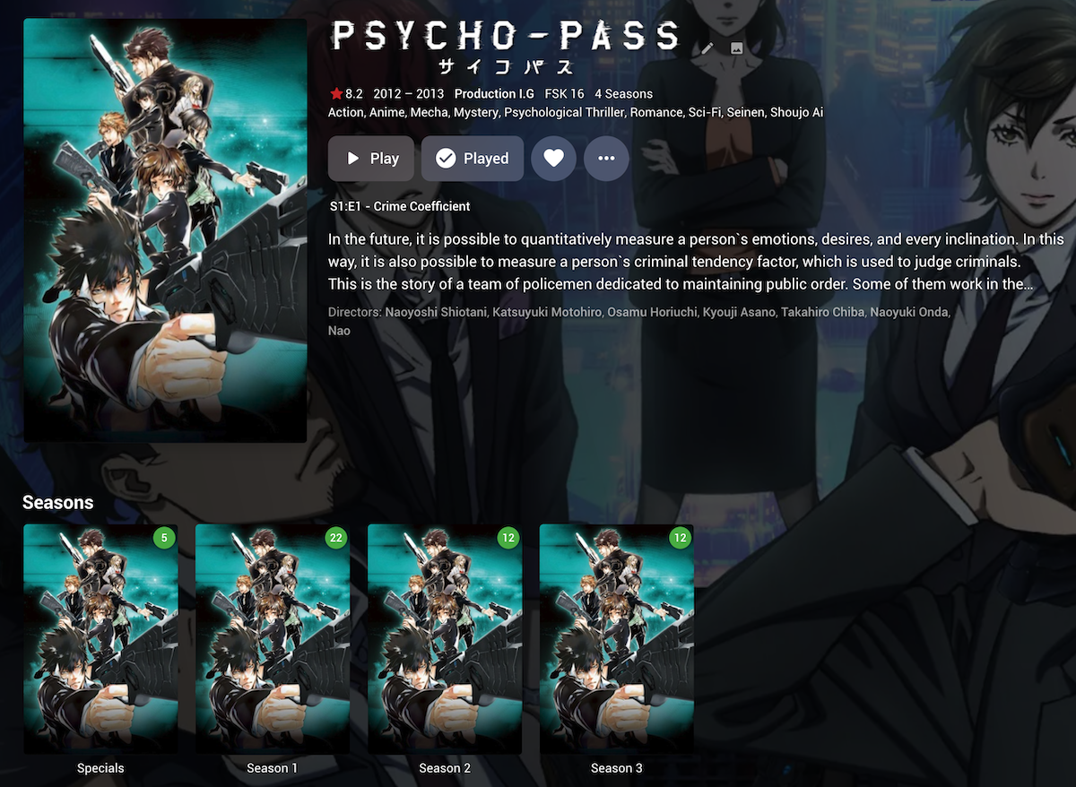 But I'm having trouble with an anime series called 'Psycho-Pass' which consists of three seasons and various movies, specials, etc. If I use the above file structure for the three seasons i.e. all three season folders under one 'Psycho-Pass' folder, Emby only fetches the details/artwork for the first season. Seasons 2 and 3 are shown but have the same episode names and artwork as season 1.