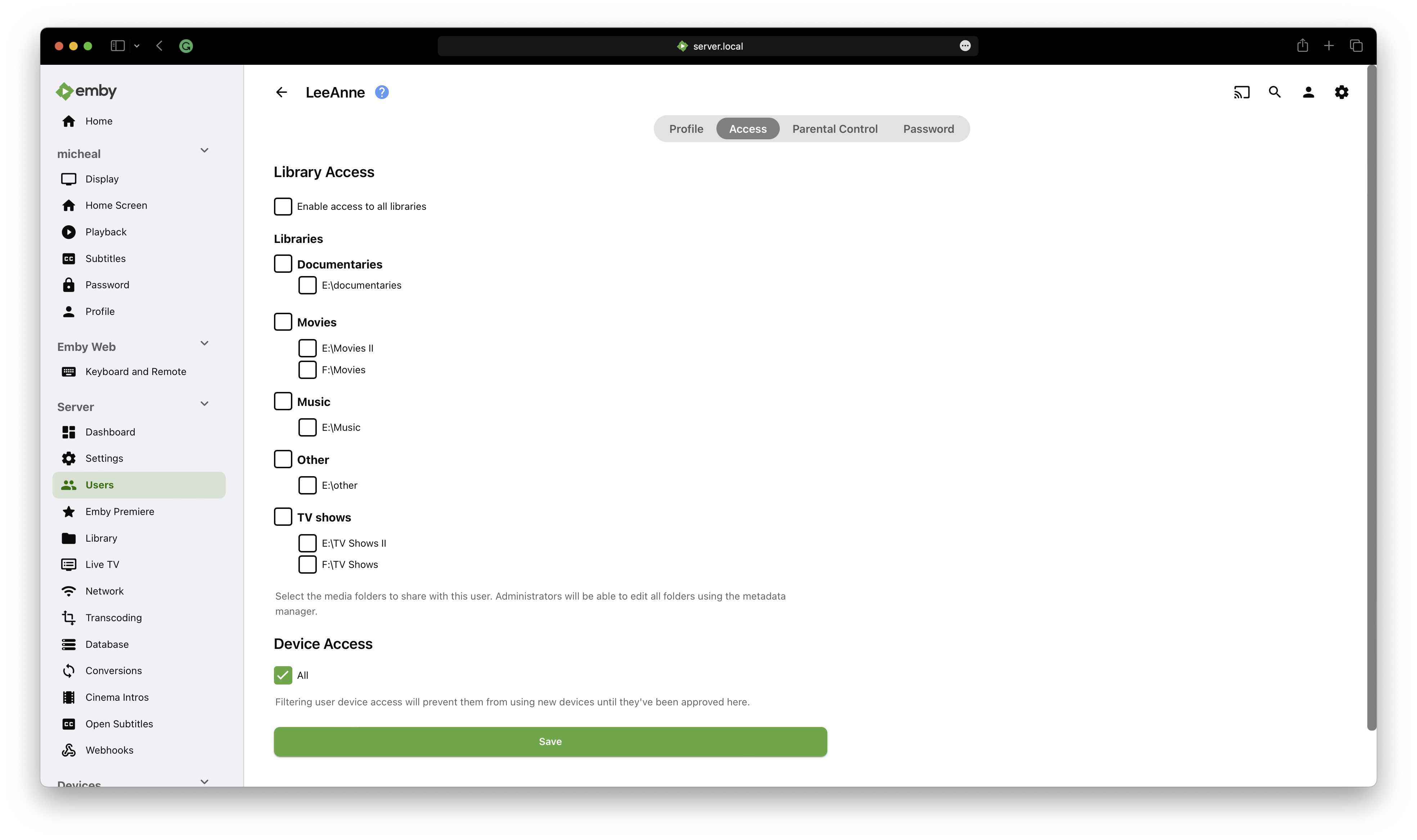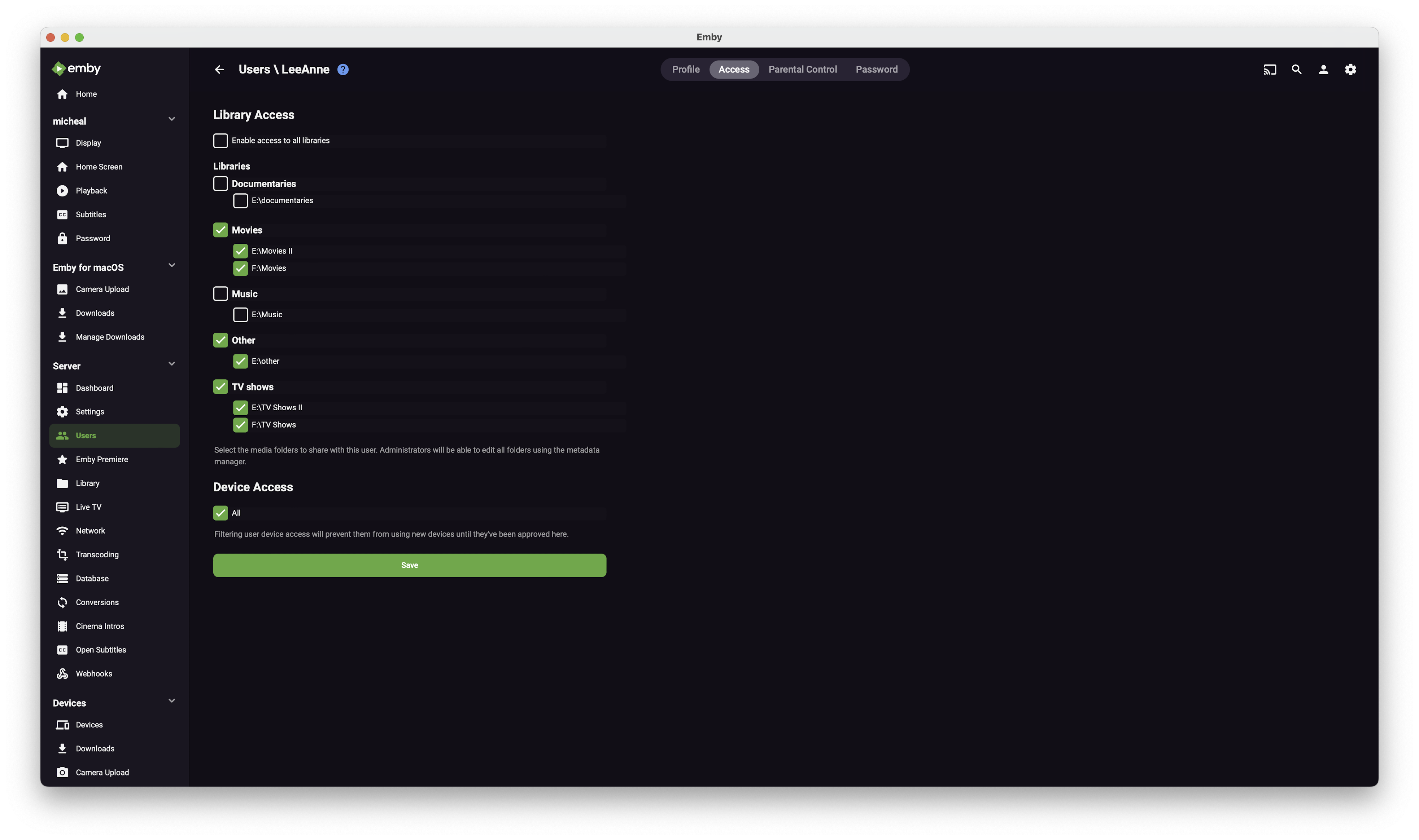 micleeso 0 Posted January 5, 2023 Author Posted January 5, 2023 14 hours ago, Luke said: Hi, can you show an example of how you configured library access for a user? Thanks. I narrowed the issue down to macOS client. If I edit the access control to the user using the macOS application the issue occurs. i.e. remove access to documentaries and music I then log into the user and all content is gone. Attached is a picture of removing said library content in macOS application. I then opened Safari and looked at the access control setting to that user. All library content was deselected, hence no access to entire library. I can successfully edit the library access control to the user using the browser portal. MacOS = "black background" Browser Portal = "White background"