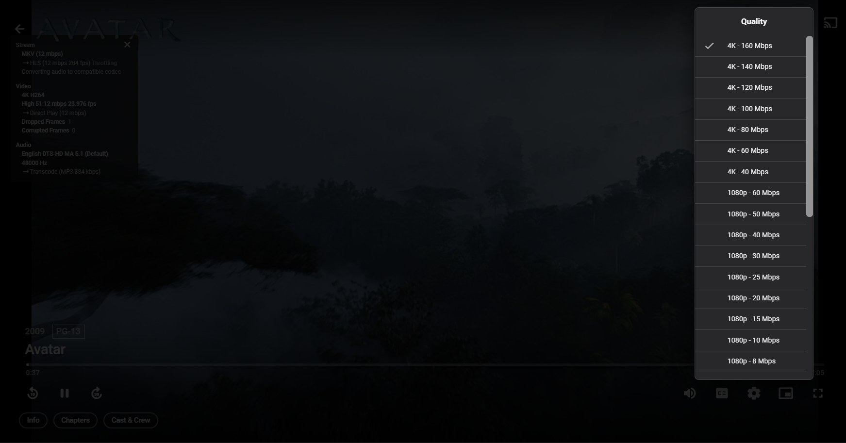 acer1204 3 Posted January 7, 2023 Author Posted January 7, 2023 (edited) On 1/6/2023 at 8:37 AM, Luke said: Hi, the video player will limit the choices based on what you're playing. Try setting the quality in the app's settings and all choices will be available there. in browser , where can setting the quality ? I change emby server with playback->Video->Home network quality to 4k but the browser still max quality is 1080p 60Mbps. I find some solution with set "maximun allowed video resolution" to change it. but in "4.7.11.0" version playback no see it. it's my screen only 1080p that the emby server auto limit the play option max is 1080p 60Mbps? Edited January 7, 2023 by acer1204