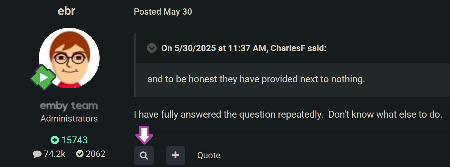 Dibbes 514 Posted August 31, 2025 Posted August 31, 2025 (edited) 16 minutes ago, CharlesF said: This is exactly a cop out. Why? Because it’s a non answer. Zero information on target when 4.9 will be officially out of beta. No updates if 5.0 has even been works on. No dates. Nothing. Just “it will be done when it’s done”. If it wasn’t for the fact I’d paid money for this I’d have moved on. It’s responses like this - to actual paying customers - that support the fact that you guys don’t really care about feedback or wish to provide paying clients with real usable information. If plex has m3u support I’d use that. I tried Jellyfin for a while and it's actually better than Emby in this regard. Not superb, mind you, but faster. Issue I had was with the formatting. It has to be fairly precise. I stopped using it as I don't want to run 2 servers for what Emby advertises (or used to) is part of their flagship features... Edited August 31, 2025 by Dibbes 1 1