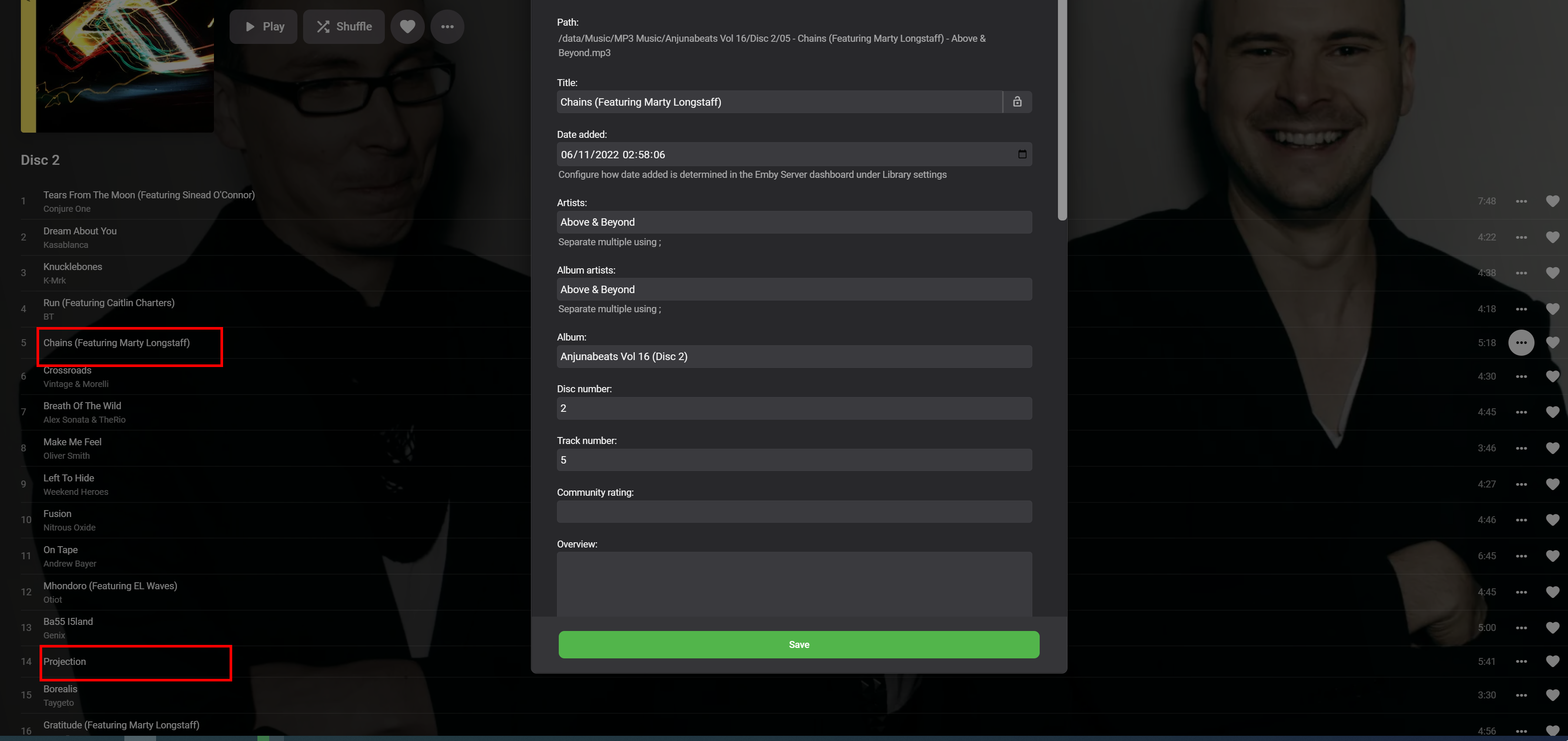paulnheshi 2 Posted January 8, 2023 Posted January 8, 2023 I've noticed a problem with the music library not displaying the Track Artist for tracks where the Track Artist is the same as the Album Artist. In the example below, i am looking at Anjunabeats Vol 16 disc2, both tracks by Above & Beyond do not display the track artist, even though it is embedded in the file (as you can see in the Edit popup for the first example track "Chains") Looking through other albums in the library, i see the same behaviour. Track Artist isn't displayed with the track if the Track Artist is the same as the album artist. I haven't seen this behaviour in any media player software before, so i expect it isn't intentional. While it doesn't impact playback, it does create a feeling of uncertainty about whether Emby is correctly handling the metadata i have embedded in my media. It would be better if Track Artist was displayed for all tracks.