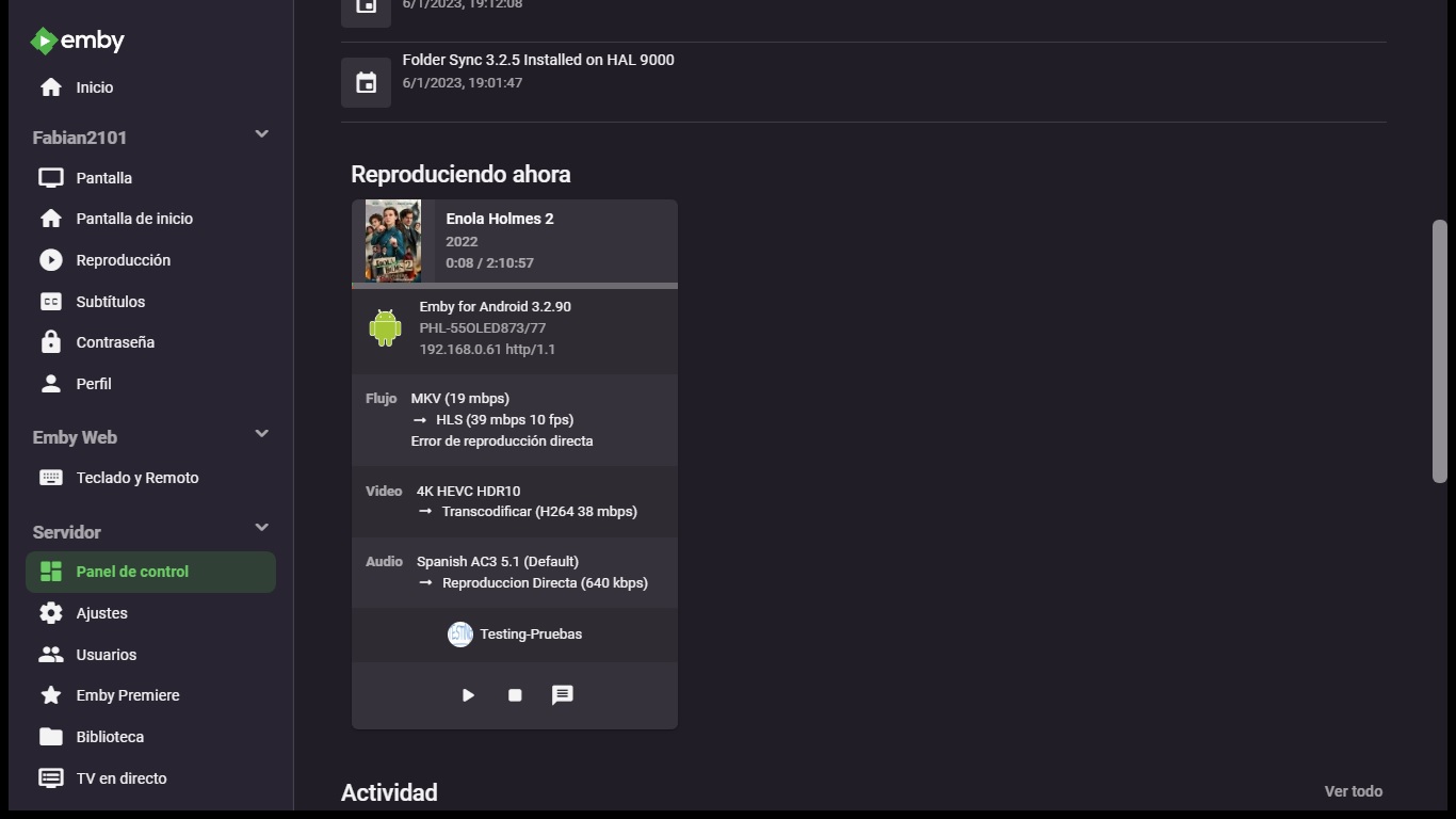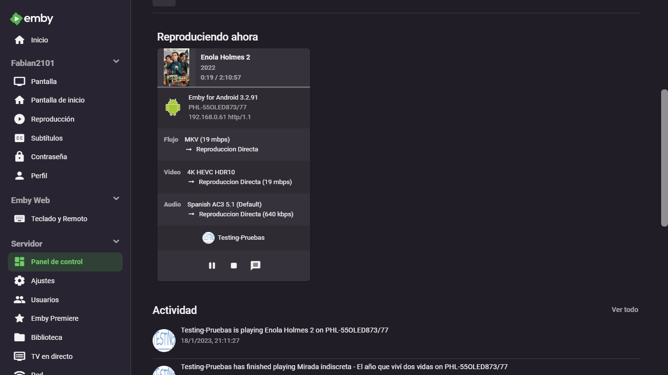 Fabian2101 23 Posted January 19, 2023 Author Posted January 19, 2023 I want to notify you that the problem with playback, with the previously mentioned files of Netflix content, which contain DV and HDR10, in my case it is completely solved, the playback is direct and without any transcoding, but for the moment the solution It is in the client for Android tablets and smartphones with version 3.2.91. The successful test was carried out on my Philips 55OLED873 television with Android TV 8, on the Xiaomi Mi Box with Android TV 9. Unfortunately, the problem persists in the client for Android TV, and what I use the most is the client for Android TV, on my four television devices to watch movies and episodes of television series in HDR quality. I attach the screenshots, where you can see my Emby server, doing direct transmission with HTTP, without any transcoding: 1