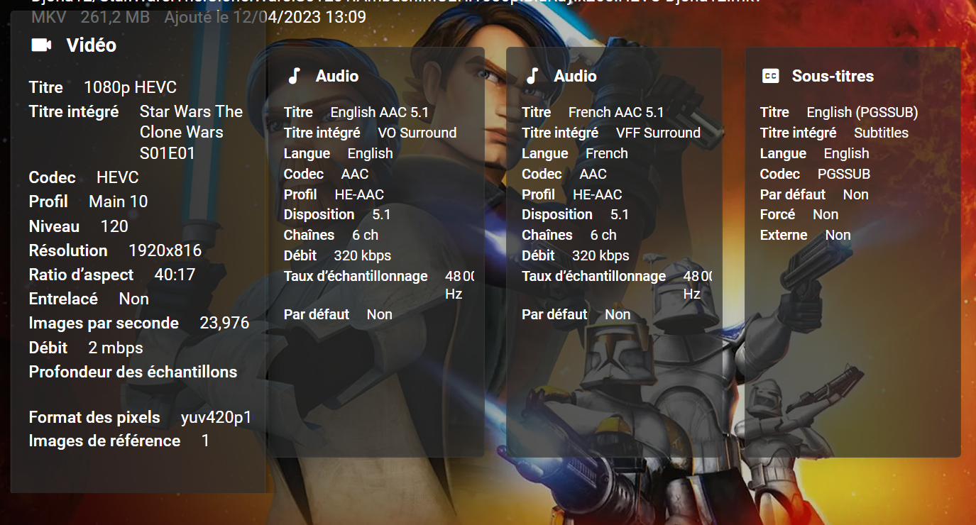 quinlan59 3 Posted April 22, 2023 Author Posted April 22, 2023 @Lukesorry for the slightly delayed response, here's the data needed. If I forgot something, let me know. Here's my problem. I'm trying to read the following video with french subs on the emby LG TV app (latest version, server is 4.7.11.0 The video loads indefinitely like this Here's the logs in attachment The video works fine on Windows PC app Emby Theater, if that help investigations Thanks! embyserver.txt ffmpeg-transcode-a0c2c34e-f1eb-4d04-9d70-096884c213e7_1.txt