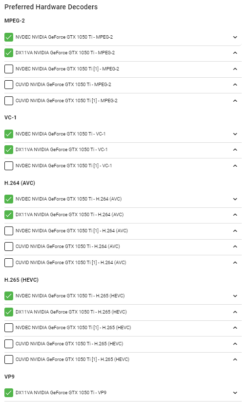 matbeebe85 2 Posted January 21, 2023 Author Posted January 21, 2023 19 minutes ago, Happy2Play said: That is usually how it works when you try to troubleshoot. Seems odd there is no ffmpeg with mkv in Chrome though as it should be at least remuxing. Seems odd you don't have a hardware decoder also. >>>>>> Hardware Encoders for h264 [X] NVENC NVIDIA GeForce GTX 1050 Ti - H.264 (AVC) [X] NVENC NVIDIA GeForce GTX 1050 Ti [1] - H.264 (AVC) >>>>>> Selected Codecs Decoder Automatic software decoder But if it happens again please post the server and ffmpeg log if present. I am using Brave browser currently. It is still chromium based, but is there a difference with remuxing? I turned on advanced settings for hardware decoding. Here is my settings for Decoding: