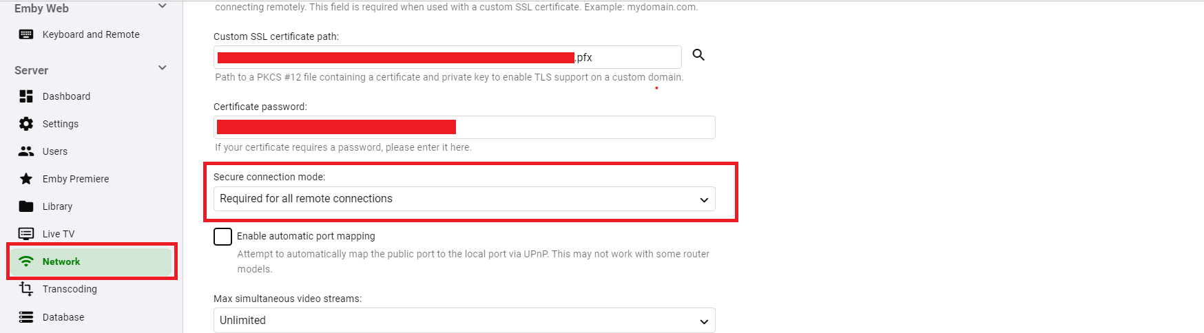GrimReaper 4740 Posted January 22, 2023 Posted January 22, 2023 1 minute ago, strander14 said: So this is where my internet company is weird - Xfinity (Comcast) with the xFi gateway gets weird. In order to manage port forwarding you have to use their mobile app... But for everything else you use the 10.0.0.1 admin panel. Weird indeed. Anyway, let's assume 8920 is also open if 8096 is forwarded and showing open - on to Emby part: You want to enter 8920 here: Also, what is your setting for Secure connection mode?