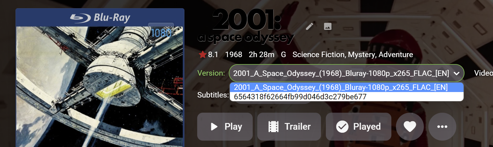 Lazarus_Long 80 Posted January 23, 2023 Posted January 23, 2023 So I'm debating between grouping when I have multiple versions of a movie (such as 4K and 1080p) and leaving them ungrouped. I thought grouping them might be nice but then I see that the Version selection ends up looking like this. Yeah I know I should probably rename my movies but that's more maintenance that I really don't want to worry about lol. Ideally it would be better if the drop-down would just maybe show the video/audio differences in the versions instead of basing it on filename? I do know that if you select a different version the video/audio to the right of the drop-down updates. Just wish it was a bit nicer looking...