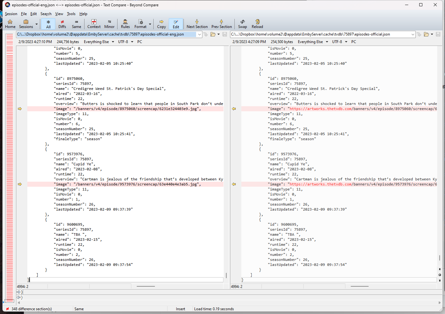 HawkXP71 112 Posted February 10, 2023 Author Posted February 10, 2023 Just now, Happy2Play said: But this could be an api cache issue as they have a lastupdated of today. 5 minutes ago, Happy2Play said: Yes Can you look in your Emby cache\tvdb\75897 folder at the episode json file at the bottom. beatified the flattened json file. }, { "id": 9573976, "seriesId": 75897, "name": "Cupid Ye", "aired": "2023-02-08", "runtime": 22, "overview": "Cartman is jealous of the friendship that’s developed between Kyle and Tolkien and decides to do something about it.", "image": "/banners/v4/episode/9573976/screencap/63e440e4e3ab5.jpg", "imageType": 11, "isMovie": 0, "number": 1, "seasonNumber": 26, "lastUpdated": "2023-02-09 17:46:52" }, { "id": 9600695, "seriesId": 75897, "name": "TBA ", "aired": "2023-02-15", "runtime": 22, "isMovie": 0, "number": 2, "seasonNumber": 26, "lastUpdated": "2023-02-09 17:47:50" } 3 minutes ago, Happy2Play said: But this could be an api cache issue as they have a lastupdated of today. I dont have an episodes.json, I do have episodes-official.json, episodes-official-eng.json and seasons.json Season 26 is showing up in the seasons.json { "id": 2043040, "seriesId": 75897, "type": { "id": 1, "name": "Aired Order", "type": "official" }, "number": 26, "nameTranslations": [], "overviewTranslations": [], "image": "https://artworks.thetvdb.com/banners/v4/season/2043040/posters/63d4a430131fb.jpg", "imageType": 7, "companies": [ { "id": 0, "primaryCompanyType": 0 } ] }, And interesting enough, the episodes-official-eng.json and episodes-official.json both include the missing episode, { "id": 9573976, "seriesId": 75897, "name": "Cupid Ye", "aired": "2023-02-08", "runtime": 22, "overview": "Cartman is jealous of the friendship that’s developed between Kyle and Tolkien and decides to do something about it.", "image": "/banners/v4/episode/9573976/screencap/63e440e4e3ab5.jpg", "imageType": 11, "isMovie": 0, "number": 1, "seasonNumber": 26, "lastUpdated": "2023-02-09 09:37:39" }, { "id": 9600695, "seriesId": 75897, "name": "TBA ", "aired": "2023-02-15", "runtime": 22, "isMovie": 0, "number": 2, "seasonNumber": 26, "lastUpdated": "2023-02-09 09:37:54" } The only difference between the official and official-eng is the location of the image
