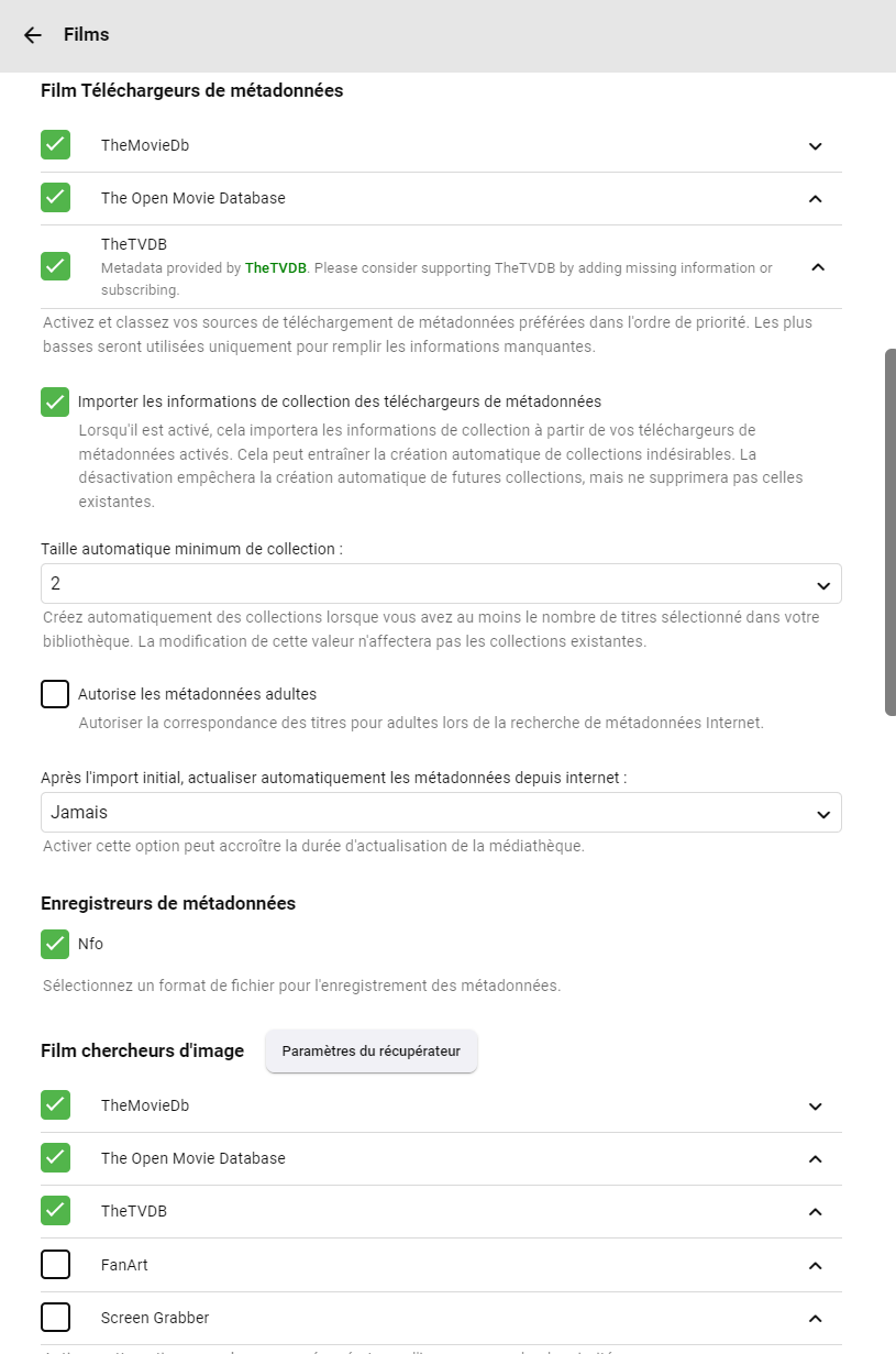 Luke 42077 Posted March 29, 2023 Posted March 29, 2023 On 3/20/2023 at 2:37 PM, Bingegang said: I tried many times since i had the answer to this topic. It's annoying @Bingegang What movie metadata fetchers are enabled on the library, and in what order? What image fetchers are enabled on the library, and in what order?