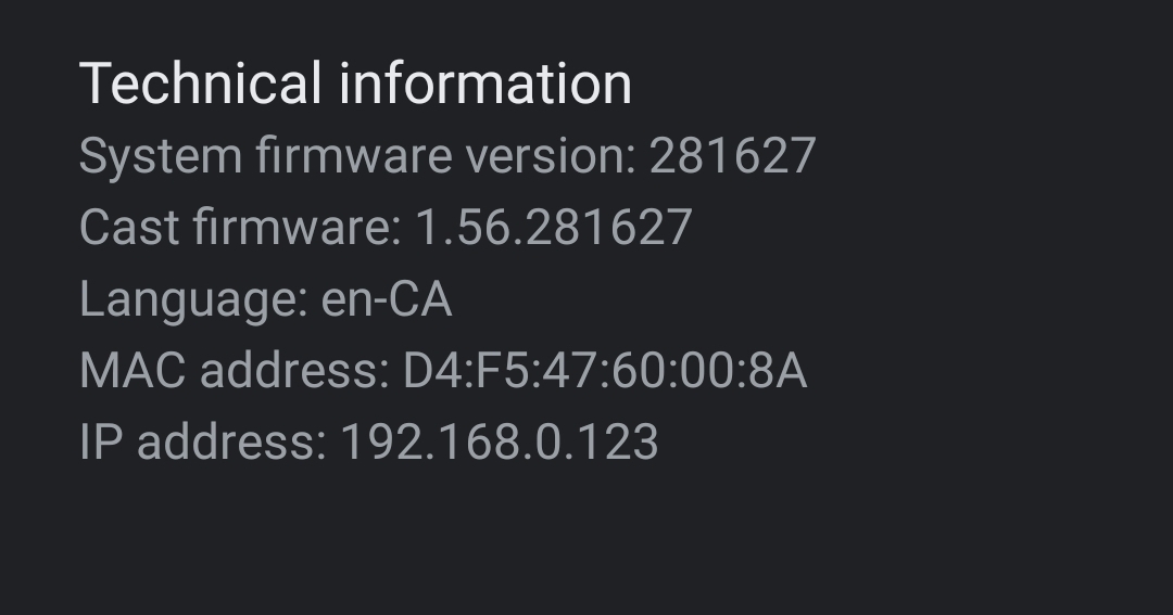 hyftar 1 Posted March 6, 2023 Author Posted March 6, 2023 2 minutes ago, Luke said: Hang on here, I don't believe the number of subtitle tracks is relevant to this. What model Chromecast is this? This is the device information. Otherwise it's a Chromecast ultra connected via ethernet.