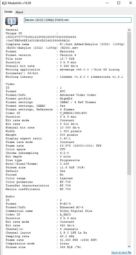 ErikaJ 65 Posted March 18, 2023 Author Posted March 18, 2023 (edited) That is what I thought as well but when I run mediainfo against the mkv file I get the following and there is data in there. So my question now is how is Emby not able to read it? Secondly, I noticed that this information appears to be missing in the nfo file. Is this where Emby is looking for the data? TIA Cheers!!! Edited March 18, 2023 by ErikaJ