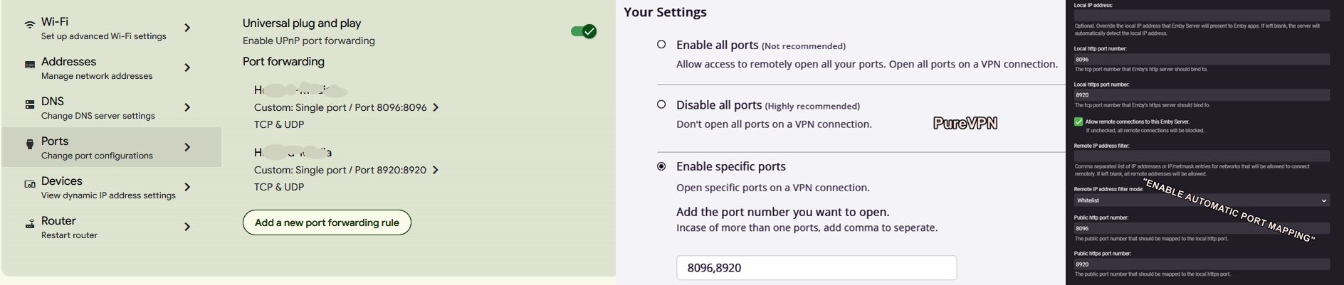 clinktone670 0 Posted March 19, 2023 Author Posted March 19, 2023 A three part photo, the first showing my Google Fiber box setting for ports, the 2nd showing my PureVPN settings, and the third showing the Emby Network page. This allows me to access Emby on both my own network here at home and when logged in remotely off of the home network. A friend also states that he can access Emby using the VPN IP address. The question now is......why would the old, non-VPN, WAN Remote Address still work???