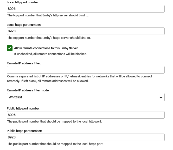 clinktone670 0 Posted March 19, 2023 Author Posted March 19, 2023 Then there should only be one port forwarding rule on my router, external 8096 and internal 8920? And this is what my Emby page looks like. Correct? REALLY appreciate the help!