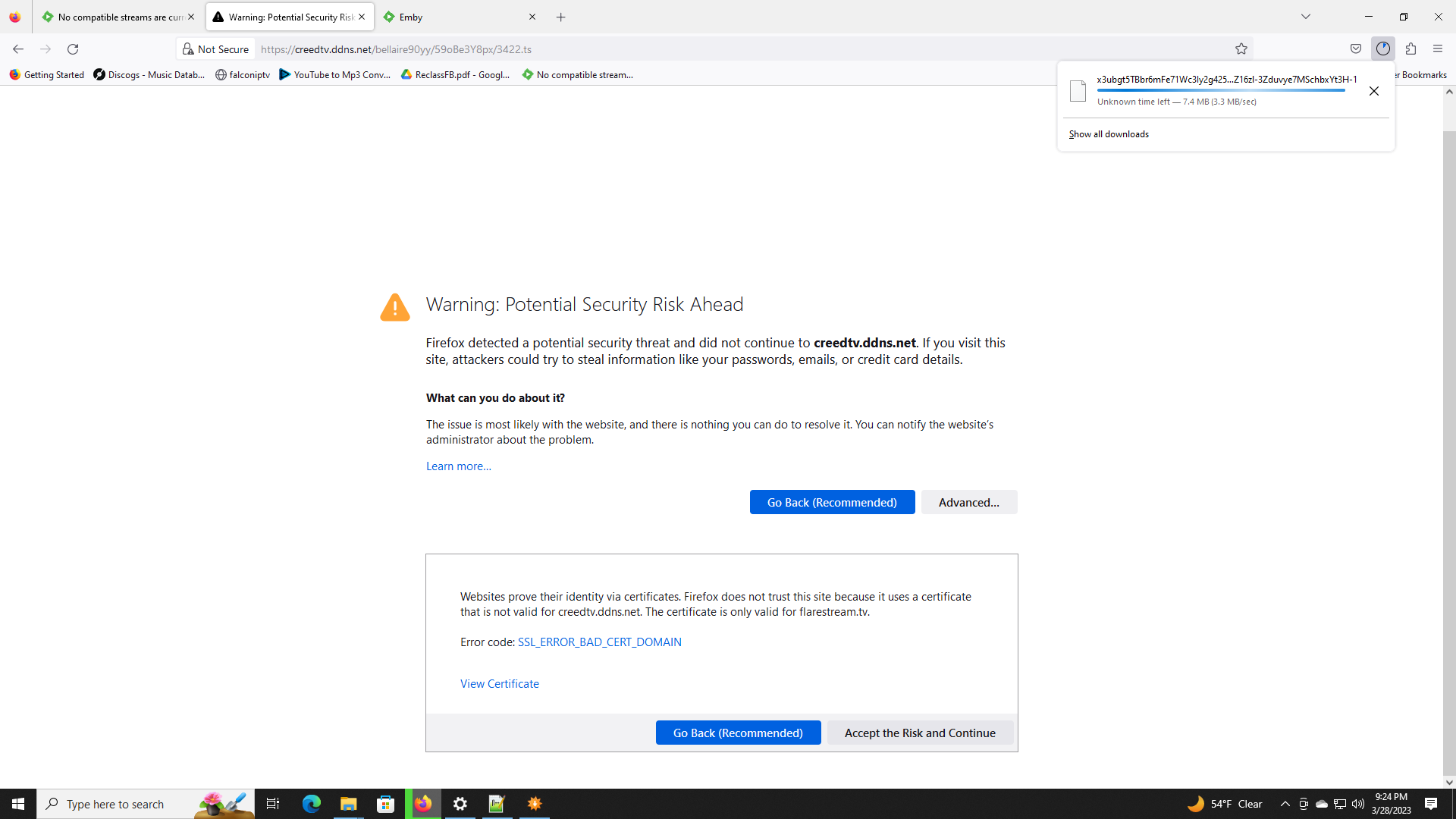 Luke 42080 Posted March 28, 2023 Posted March 28, 2023 Hi, yea if you look at the server log, there's some kind of problem with the ssl certificate of the server hosting the video stream: 2023-03-27 21:29:40.206 Error HttpClient: Error getting response from https://host6:443/x_path2_x/x_path3_x/x_path4_x *** Error Report *** Version: 4.7.11.0 Command line: C:\Users\user\AppData\Roaming\Emby-Server\system\EmbyServer.dll -noautorunwebapp Operating system: Microsoft Windows 10.0.19045 Framework: .NET 6.0.10 OS/Process: x64/x64 Runtime: C:/Users/user/AppData/Roaming/Emby-Server/system/System.Private.CoreLib.dll Processor count: 8 Data path: C:\Users\user\AppData\Roaming\Emby-Server\programdata Application path: C:\Users\user\AppData\Roaming\Emby-Server\system System.Net.Http.HttpRequestException: System.Net.Http.HttpRequestException: The SSL connection could not be established, see inner exception. ---> System.Security.Authentication.AuthenticationException: The remote certificate is invalid according to the validation procedure: RemoteCertificateNameMismatch at System.Net.Security.SslStream.SendAuthResetSignal(ProtocolToken message, ExceptionDispatchInfo exception) at System.Net.Security.SslStream.CompleteHandshake(SslAuthenticationOptions sslAuthenticationOptions) at System.Net.Security.SslStream.ForceAuthenticationAsync[TIOAdapter](TIOAdapter adapter, Boolean receiveFirst, Byte[] reAuthenticationData, Boolean isApm) at System.Net.Http.ConnectHelper.EstablishSslConnectionAsync(SslClientAuthenticationOptions sslOptions, HttpRequestMessage request, Boolean async, Stream stream, CancellationToken cancellationToken) --- End of inner exception stack trace --- at System.Net.Http.ConnectHelper.EstablishSslConnectionAsync(SslClientAuthenticationOptions sslOptions, HttpRequestMessage request, Boolean async, Stream stream, CancellationToken cancellationToken) at System.Net.Http.HttpConnectionPool.ConnectAsync(HttpRequestMessage request, Boolean async, CancellationToken cancellationToken) at System.Net.Http.HttpConnectionPool.CreateHttp11ConnectionAsync(HttpRequestMessage request, Boolean async, CancellationToken cancellationToken) at System.Net.Http.HttpConnectionPool.AddHttp11ConnectionAsync(HttpRequestMessage request) at System.Threading.Tasks.TaskCompletionSourceWithCancellation`1.WaitWithCancellationAsync(CancellationToken cancellationToken) at System.Net.Http.HttpConnectionPool.GetHttp11ConnectionAsync(HttpRequestMessage request, Boolean async, CancellationToken cancellationToken) at System.Net.Http.HttpConnectionPool.SendWithVersionDetectionAndRetryAsync(HttpRequestMessage request, Boolean async, Boolean doRequestAuth, CancellationToken cancellationToken) at System.Net.Http.DiagnosticsHandler.SendAsyncCore(HttpRequestMessage request, Boolean async, CancellationToken cancellationToken) at System.Net.Http.RedirectHandler.SendAsync(HttpRequestMessage request, Boolean async, CancellationToken cancellationToken) at System.Net.Http.HttpClient.<SendAsync>g__Core|83_0(HttpRequestMessage request, HttpCompletionOption completionOption, CancellationTokenSource cts, Boolean disposeCts, CancellationTokenSource pendingRequestsCts, CancellationToken originalCancellationToken) at Emby.Server.Implementations.HttpClientManager.CoreHttpClientManager.SendAsyncInternal(HttpRequestOptions options, String httpMethod) Source: System.Net.Http TargetSite: Void MoveNext() InnerException: System.Security.Authentication.AuthenticationException: The remote certificate is invalid according to the validation procedure: RemoteCertificateNameMismatch Try to find the stream url in the m3u and put it into the browser address bar. What happens there?