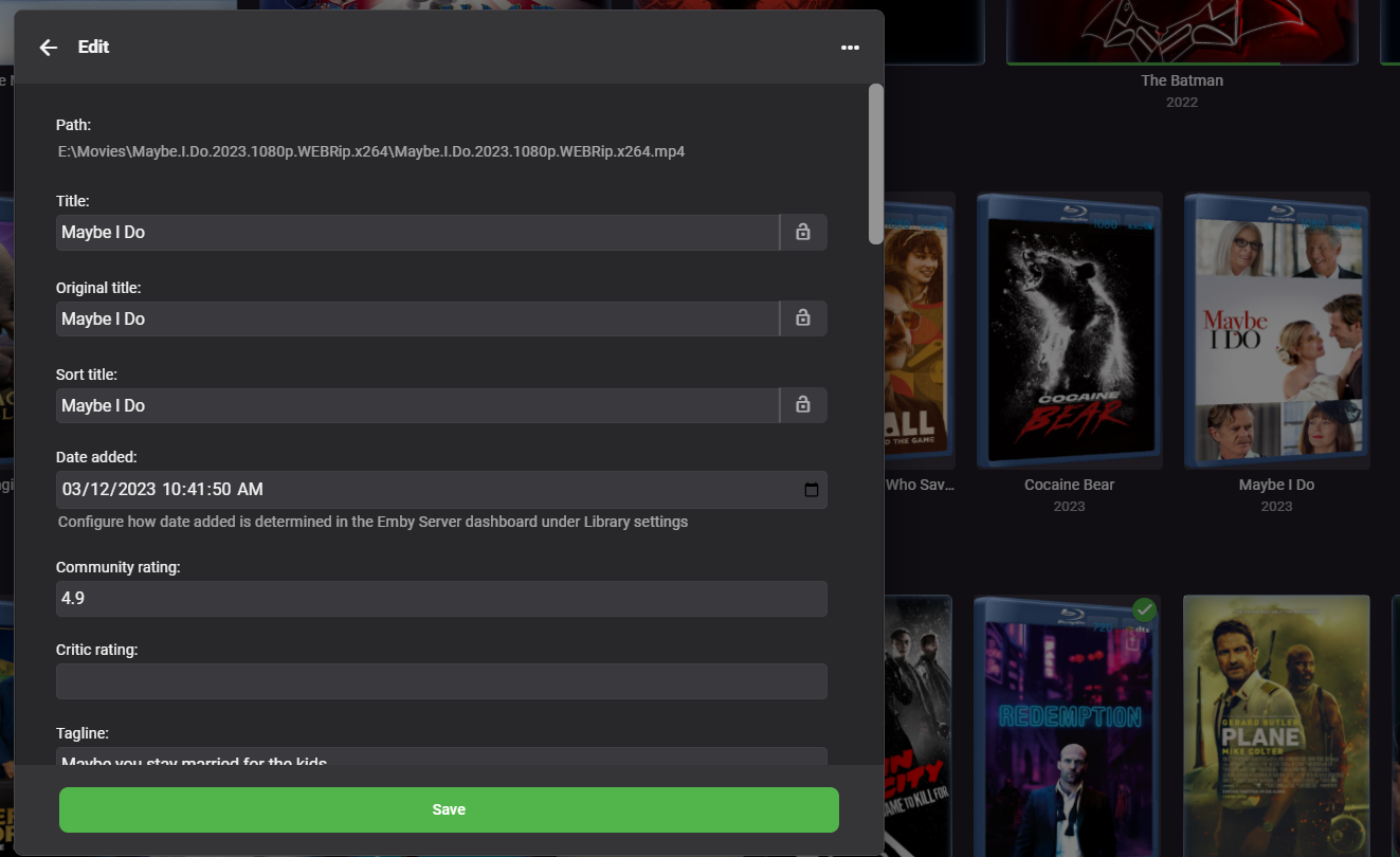 ebr 16177 Posted April 12, 2023 Posted April 12, 2023 Hi. Okay, this is a naming and identification problem. You can see from the title shown under the item that it has not been matched with any movie (it is just the file name). If I search tmdb for "A Good Person 2023 1080p WEBRip x264" which is how your file is named, I get zero results. Organizing your movies into individual folders with more accurate names (e.g. "A Good Person (2023)") would undoubtedly help. A search for "A good person" on tmdb returns the proper result.