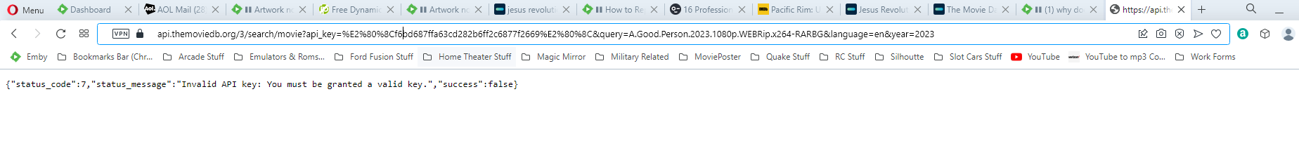 Chipsta040365 4 Posted April 13, 2023 Author Posted April 13, 2023 2 hours ago, roaku said: I was able to resolve my version of this issue after pulling a tmdb api url out of the log and testing it. https://api.themoviedb.org/3/search/movie?api_key=***&query=The+Sting&language=en&year=1973 For me, this endpoint worked fine in a browser on my desktop, but the same endpoint was returning an empty result set from my Emby host. So, I turned my host off and on again, and of course, that fixed it and Emby is able to retrieve results from tmdb normally again. Not sure if the OP's issue is the same, but it's worth trying. That's interesting when I try a manual test I get invalid key