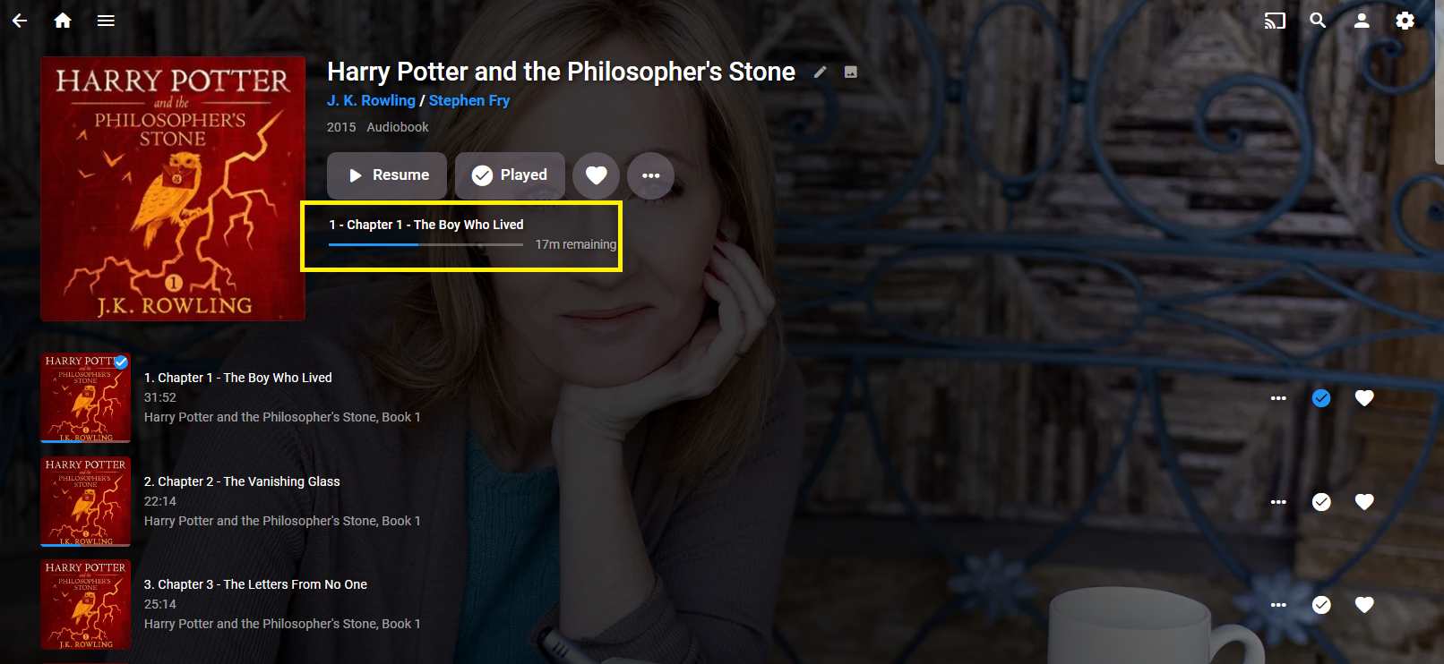 stephen_hill 46 Posted April 13, 2023 Posted April 13, 2023 Hi I have this problem that quite often Emby will try to resume an audio book from a previous chapter, even if that chapter has been marked as played, and there is progress in the next chapter. Here is an audio book I am listening to and Emby thinks that this is where I want to continue from. However, I have listened to this chapter in full and thus, Emby marked it as Played. However, if we look at the list of chapters, you will see that I am actually part way through chapter 17. Are you aware of this issue and is there anything that can be done to fix it? For info, I'll add that I listen to my audiobooks in the car using the Android app. I stream the audio over 4G internet. And the audio is via bluetooth to my car. Cheers Stephen