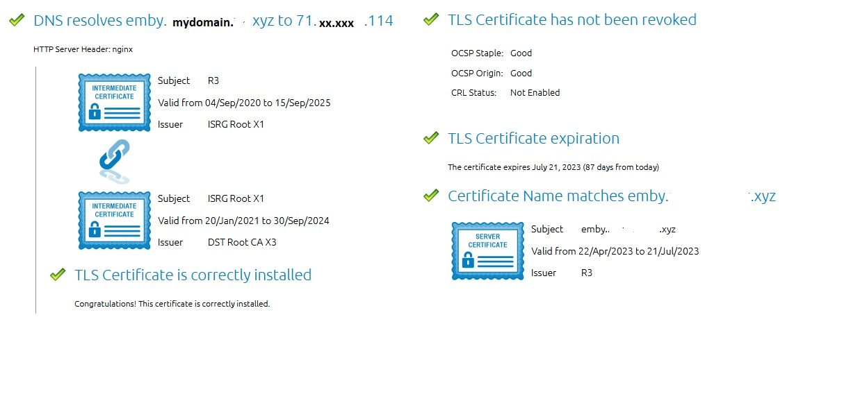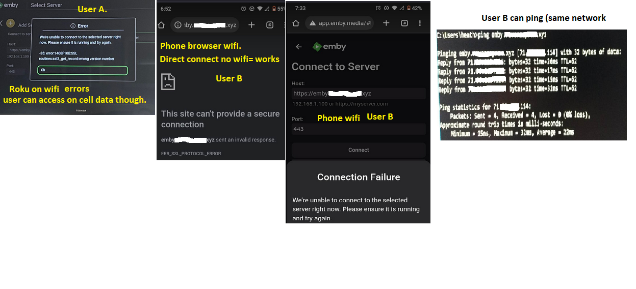 indianaguy 2 Posted April 25, 2023 Author Posted April 25, 2023 (edited) On 4/22/2023 at 7:35 PM, Luke said: Hi, what model Roku? Is the Roku software up to date? I know this isnt the info you've asked for but I've yet to hear back from this User. This may even belong in another thread as i have several users having issues now but I have some that connect with no issues so it's quite baffling. User A in referenced pic was using Roku. User B in ref is using phone browsers & playstation browsers at times. Both Users have no access on their networks, but do on cell data. Both at one point or another have some kind of error mentioning ssl/ssl3. I know for sure user b can ping the server address from a pc on the same network. Please advise on possible next steps to look into. Emby is in a docker on unraid Swag as a docker as well Ports are forwarded in router etc domain through namecheap Edited April 25, 2023 by indianaguy