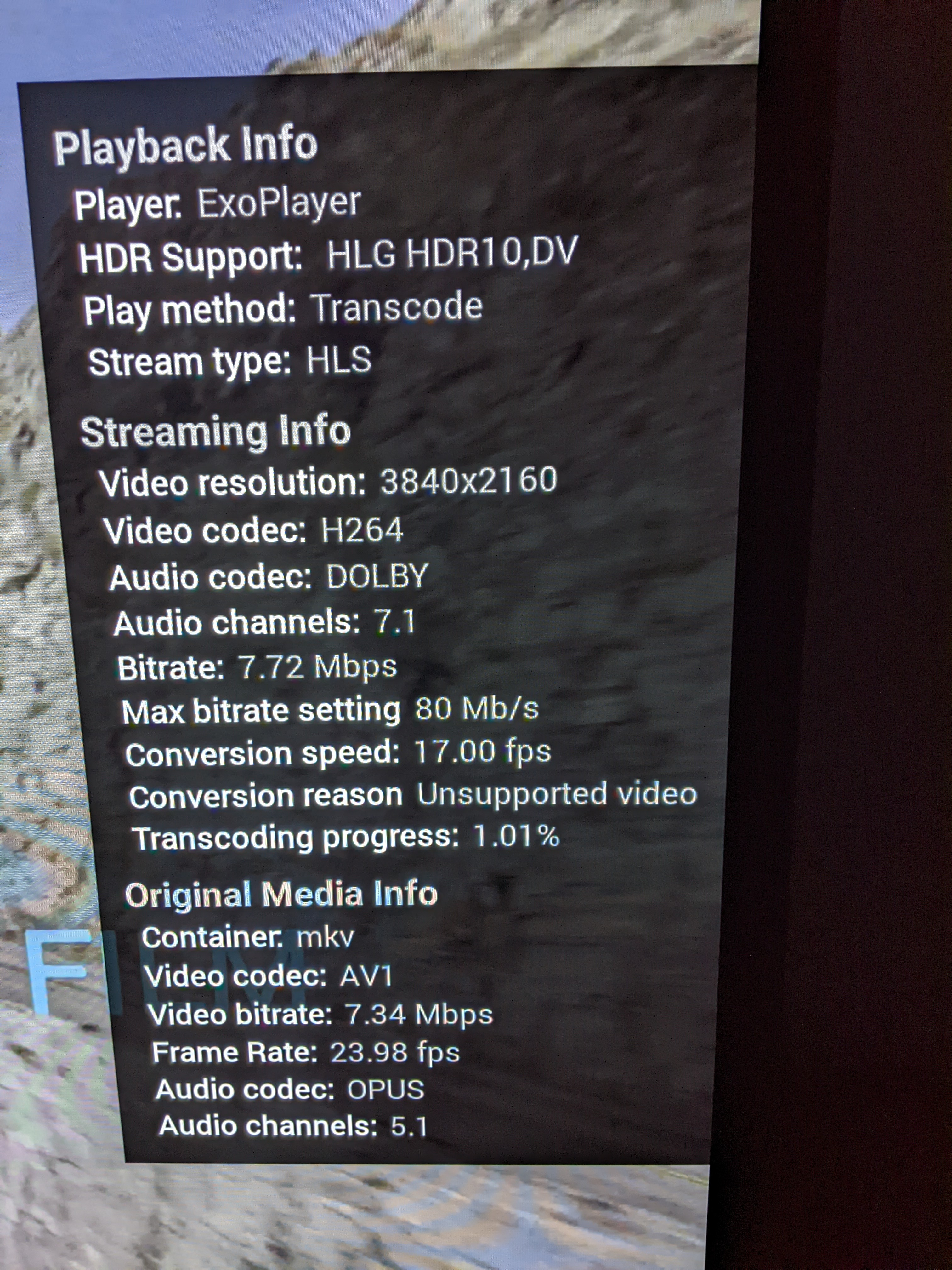 musicmafia 38 Posted April 27, 2023 Author Posted April 27, 2023 12 hours ago, VirulentPip said: AV1 in general is a tricky one at the moment, since getting a 4K Max and Cube Gen 3 I've had no end of issues with AV1 being detected as being able to be played back via Hardware Decoding, it either transcodes to H264 or enables software decoding which then juddering occurs. As far as your HEVC file which is much more supported, it's the DTS-HD audio that wasn't on your device. So it all depends what you want, AV1 should work eventually with Emby properly with devices that support it, however HEVC is much better supported (and the default codec for 4K), the Nvidia Shield Pro 2019 although doesn't support AV1 it does support pretty much every audio codec you throw at it and it also has a Gigabit Ethernet port so that high bitrate 4K (HEVC/H265) files aren't an issue. Thanks. I've only got a few AV1 files, so I'm more concerned with the hundreds of other files at this point. Sounds like the problem with the HEVC files are the ones with DTS-HD. I'm getting twice the wi-fi speed (85mbps) using internal Emby app on the TV but still having issues with the DTS-HD file. So this means that the problem is my brand new top of the line Sony is the problem with DTS-HD?