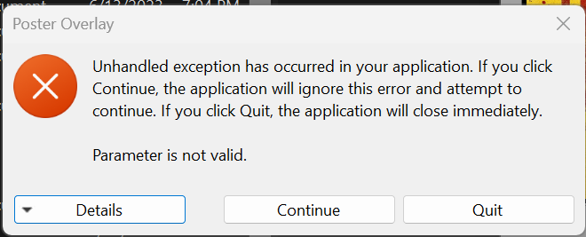 denzoid 57 Posted February 3, 2025 Posted February 3, 2025 (edited) 3 hours ago, sh0rty said: Please try this one. If that doesn't fix the issue, we're outta luck here since I'm altering code without being able to repro the error ... PosterOverlayGUI_Test.zip 1.13 MB · 0 downloads Thanks for working on this for me, I really appreciate it! I launched it, and it asked for runtime 8.0.12 which I installed. This time it showed a different error but it didn't have any option to see details. Edited February 3, 2025 by denzoid