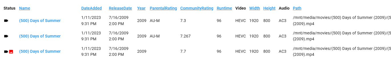 media@qna.net.au 0 Posted April 28, 2023 Posted April 28, 2023 So was looking to do a double check on movie is emby equals movies on disk and came across a strangle lot of duplications, where the same movie & the same path and file is now showing up multiple times as below So I installed Report plugin to see how many of this have occurred and there is quite a few. It seems to be something to do with the metadata as you will see in the example below the only difference is the parent rating, community rating. I have check and double check single file in same directory. Strange right? So question anyone else seeing this problem? Is there a way to resolve it?