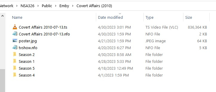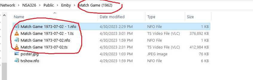 csadoian 36 Posted May 1, 2023 Author Posted May 1, 2023 1 hour ago, Luke said: Hi, did these end up getting an episode number via internet metadata after the recording had completed? The ones I recorded yesterday and referred to in my posting are gone now, we watched and deleted them. However, this morning two more recorded and I see one of them got an episode number, but the other didn't. However, they were listed a bit different in the guide as opposed to two other airing of this show that occur later in the day. I can't go back to this morning, but tomorrow on the early airings when I bring up the detail for the program while in the grid guide, just under the title it displays "104 M15+". In the later airing all it shows in this area is TV-PG. A better example would be the program "Covert Affairs". It will air today at 2pm on my local 43.10 (StartTV). No season/episode is given in the listing, but right under the title it show "Repeat 14". When it records, Emby will put it in the folder "Covert Affairs", but not in a Season folder. It will give it the filename "Covert Affairs 2010-07-20.ts" (I'm guessing at the date, Emby has not recorded it yet). Emby will generate a corresponding nfo file. What's also interesting is this episode will NOT show up in my recordings list no matter where I look. The reason I know it records is I actually open up the Covert Affair file folder using Windows Explorer. I've been recording the series for quite a while, so each day I use Windows Explorer to find the episode, identify the Season/Episode number and rename the file accordingly (i.e. "Covert Affairs S01E10". I delete the .nfo file and move the newly rename file into it's proper season folder and within a few minutes Emby will pick it up and generate a new .nfo and the Episode will appear in the recordings list. I will attach a screenshot of the folder for the episode recorded yesterday and the corresponding .nfo file Emby generated (I have not moved/renamed the episode yet). At this point this episode is invisible to Emby. Note the nfo file attached to this episode has a description that basically describes the season in general, and not the episode. Covert Affairs 2010-07-13.nfo