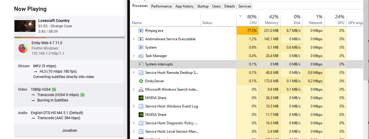 Luke 42083 Posted May 10, 2023 Posted May 10, 2023 3 minutes ago, Jonathan1683 said: Hello Is this a new feature it's using? I have had this setup over five years and have not encounted the server behaving like this before and i have never seen it say "burning subtitles". Is there way to throttle this behavior so it doesn't crash the server? I was watching it do it's thing and it finished in about 5 mins so it seems this process priority is way too high. I found a throttle option in in trancoding options, which kind of helps, but all it really does is red line for a few seconds and stops and starts over again which doesn't seem like the best way to handle this. Maybe if this process went on over 30 mins it would make more sense at like 20% utilization. EG it sees the cpu usage and dials down to keep it less than 90% capacity while also using it's full potential based on everyones total usage. Right now I am using 100% cpu while everyone else us crusing using nothing with nvenc, but everyone gets kicked off because the server is unstable just from my one server request. Regarding subtitles thanks for the heads up, I do have subtitle download enabled and I have a premium subscription to opensubs, so not sure why it wouldn't be downloading them. I have had issues like this for a long time and I assume that if I get that working correctly I won't run into this anymore. I will have to check when I get home if they are not downloaded for this specific show, maybe that is why I don't encounter it often. I just thought it was odd this happned twice in one day that my server crashed. At one point ffmpg was still running with no streams so it may be bugging out with the cpu usage so high as well. Thanks for the assistance! Hi, burning in subtitles is not a new feature, and it's a very intensive process even for powerful machines. Some tips to avoid it: Turn off the subtitles prior to playback Use external text subtitles instead, such as .srt files Play using an Emby app that can direct play more formats without transcoding, such as Emby Theater for Windows: https://emby.media/emby-theater.html Please let us know if this helps. Thanks.