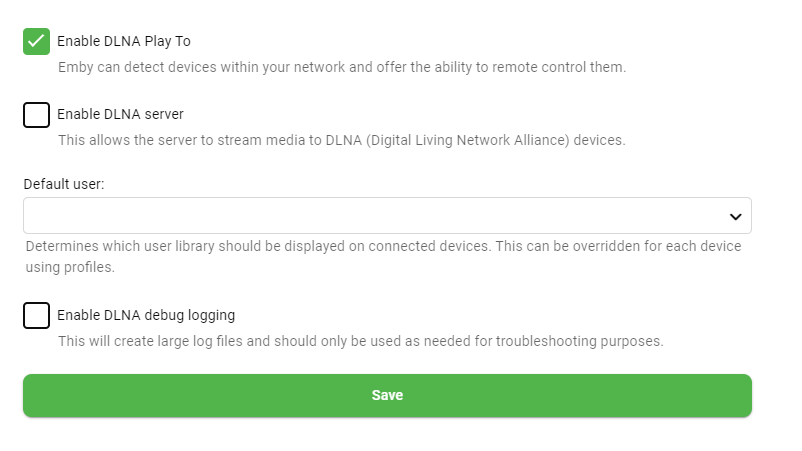 musicmafia 38 Posted May 22, 2023 Author Posted May 22, 2023 10 minutes ago, Luke said: .......Anyway, you could try turning off Emby Server DLNA features, then restart the server and the TV, and see if the flagging stops. Thanks Luke. Here's what I have now. I don't think I clicked anything there, so I assume these are default settings? So I should untick all? Should I set my account as default user (it's blank now)?