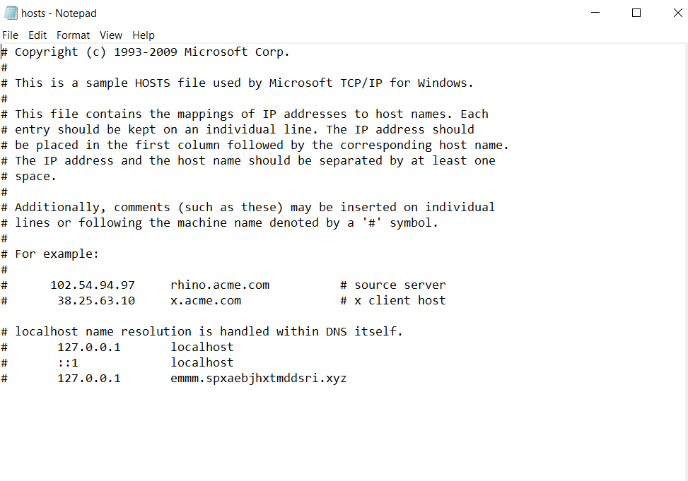 CBers 7451 Posted May 25, 2023 Posted May 25, 2023 Add a new line and enter the following: 127.0.0.1 emmm.spxaebjhxtmddsri.xyz Then save and close the file. That way, it something tries to get to emmm.spxaebjhxtmddsri.xyz, it will get blocked/redirected to your computer. 1 1