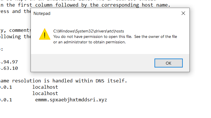 CaseyP 17 Posted May 25, 2023 Posted May 25, 2023 1 minute ago, CBers said: Add a new line and enter the following: 127.0.0.1 emmm.spxaebjhxtmddsri.xyz Then save and close the file. That way, it something tries to get to emmm.spxaebjhxtmddsri.xyz, it will get blocked/redirected to your computer. The image looks like it might be notepad, and windows doesn't like/let you save over the hosts file.. So @Methodman104 after you add the line to the text file as CBers stated, you might have to save the file to a different location on your computer, for instance, the desktop. The file will then be hosts.txt instead of hosts. (You may also need to enable, "show known file extensions" in windows) You'll rename hosts.txt to hosts (the icon will go from a text document to a blank document) Then you can copy/paste/overwrite the hosts file (youll need to give admin write rights) 1 1