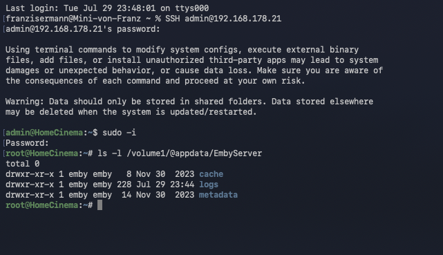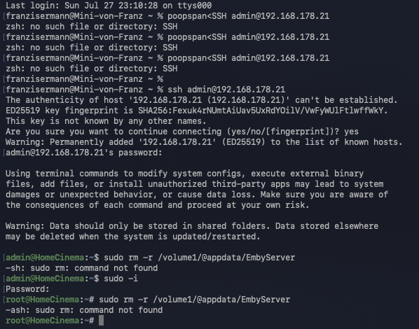poopspan 0 Posted July 29, 2025 Posted July 29, 2025 On 7/28/2025 at 2:06 AM, Grimmer said: sudo rm -r /volume1/@appdata/EmbyServer The sudo should take care of any file permission errors. Did you use the <tab> auto complete as you typed the target directory? It will fill in the special characters and ensure that it is the correct upper/lower case. Also, be sure that any emby server background tasks have been stopped. Have you tried logging into the NAS via the web interface? I've had files inappropriately get locked by Windows SMB and when logged into the NAS web interface as admin it will allow me to delete them. Sorry, but nothing happens when I enter the sudo command. I copied it from your line and typed it out, but it always works the same. I'm attaching an image.