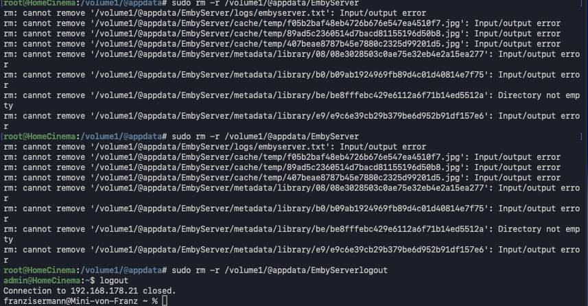 Luke 42077 Posted July 27, 2025 Posted July 27, 2025 43 minutes ago, poopspan said: Ich habe alles ausprobiert ...ich komme auf den server über das Terminal aber ich kann nichts löschen. wenn ich emby starte dann beendet es sich direkt wieder. ich habe gehört man muss den Ordner löschen...volume1/@appdata/EmbyServer aber den kann ich nicht löschen. root@HomeCinema:~# rm -r /volume1/@appdata/EmbyServer rm: cannot remove '/volume1/@appdata/EmbyServer/logs/embyserver.txt': Input/output error rm: cannot remove '/volume1/@appdata/EmbyServer/cache/temp/f05b2baf48eb4726b676e547ea4510f7.jpg': Input/output error rm: cannot remove '/volume1/@appdata/EmbyServer/cache/temp/89ad5c2360514d7bacd81155196d50b8.jpg': Input/output error rm: cannot remove '/volume1/@appdata/EmbyServer/cache/temp/407beae8787b45e7880c2325d99201d5.jpg': Input/output error rm: cannot remove '/volume1/@appdata/EmbyServer/metadata/library/08/08e3028503c0ae75e32eb4e2a15ea277': Input/output error rm: cannot remove '/volume1/@appdata/EmbyServer/metadata/library/b0/b09ab1924969fb89d4c01d40814e7f75': Input/output error rm: cannot remove '/volume1/@appdata/EmbyServer/metadata/library/be/be8fffebc429e6112a6f71b14ed5512a': Directory not empty rm: cannot remove '/volume1/@appdata/EmbyServer/metadata/library/e9/e9c6e39cb29b379be6d952b91df157e6': Input/output error Bitte helft mir was kann ich machen damit es wieder funktioniert. Hi, did you ssh into the nas?