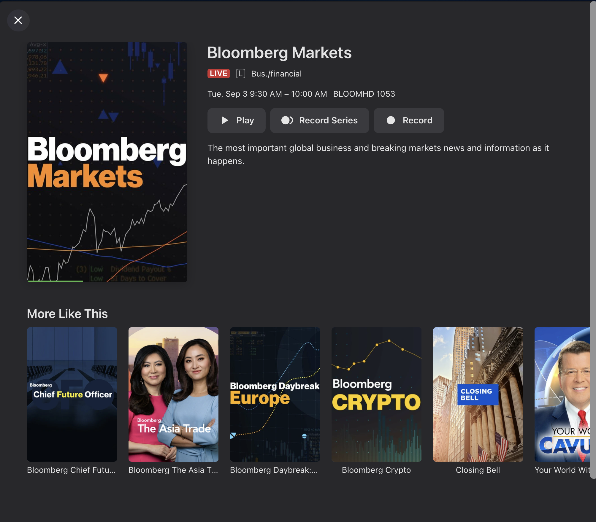 zaHrecsohbiw 14 Posted September 3, 2024 Posted September 3, 2024 On 8/31/2024 at 3:58 PM, ebr said: Hi. Example? This is obviously very thorough and has a lot of useful metadata. I just find it curious that it does _not_ include US ratings in this case. (Note: it at least makes sense that for this example, the displayed rating is wrong in the guide. It makes less sense in the aforementioned examples where US ratings _are_ available but still not displayed.) It seems like the intention in the GUI is to also display all provided qualifiers and genres? Perhaps not. I swear I've seen at least two qualifiers listed at once before, but I could be misremembering. I don't know if you have a way of prioritizing the most relevant qualifiers and omitting the ones that don't matter, or if they manage some other logic, etc. { "startTime": "2024-09-03T16:30Z", "endTime": "2024-09-03T17:00Z", "duration": 30, "qualifiers": [ "CC", "HD 1080i", "HDTV", "Live", "New" ], "channels": [ "353" ], "program": { "tmsId": "SH027293710000", "rootId": "11766722", "seriesId": "11766722", "subType": "Series", "title": "Bloomberg Markets", "releaseYear": 2015, "releaseDate": "2015-05-11", "origAirDate": "2015-05-11", "titleLang": "en-GB", "descriptionLang": "en", "entityType": "Show", "genres": [ "Bus./financial", "News" ], "longDescription": "The most important global business and breaking markets news and information as it happens.", "shortDescription": "The most important global business and breaking markets news and information as it happens.", "topCast": [ "Vonnie Quinn", "Shery Ahn", "Matt Miller" ], "ratings": [ { "body": "Departamento de Justiça, Classificação, Títulos e Qualificação", "code": "L" }, { "body": "Australian Classification Board", "code": "G" } ], "preferredImage": { "width": "480", "height": "720", "uri": "assets/p11766722_b_v8_ac.jpg?w=480&h=720", "category": "Banner-L1", "text": "yes", "primary": "true", "tier": "Series" } }, "station": { "stationId": "71799", "callSign": "BLOOMHD", "videoQuality": { "signalType": "Digital", "truResolution": "HD 1080i", "videoType": "HDTV" }, "channel": "353", "preferredImage": { "width": "720", "height": "540", "uri": "assets/s71799_ll_h15_ab.png?w=720&h=540", "category": "Logo", "primary": "true" } } }