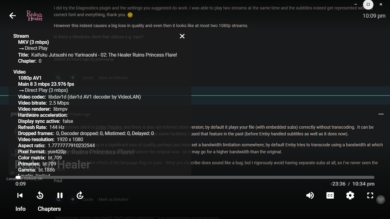 justmeyep 5 Posted June 9, 2023 Author Posted June 9, 2023 12 hours ago, pwhodges said: The windows client is Emby Theatre, and there is also a(n inferior) store version; by default it plays your file (with embedded subs) correctly without transcoding. It can be configured to use an external player, but doing so loses some facilities; I used that feature in the past (before Emby handled subtitles as well as it does now). Thank you for the link, this version of Emby Theatre, not like the one in the store, seems to display them without issue. External subtitles seem to work as good as the embedded ones. Unfortunately the app immediately becomes nonfunctional/freezes when trying to seek in my AV1 files and issues such as this occur: It also freezes when exiting out of AV1 playback. When it freezes, the app must be force closed. 12 hours ago, pwhodges said: If transcoding is leading to a significant loss of quality, perhaps you have set a bandwidth limitation somewhere; by default Emby tries to transcode using a bandwidth at which the AVC encode will match the quality of whatever the original was - so it may go for a higher bandwidth than the original. It should be set to the highest option everywhere, I assume it uses a slower preset because the hardware isn't strong enough. 12 hours ago, pwhodges said: I don't know about the effect of the language flag on subs. What you describe does sound like a bug; but I rigorously avoid having separate subs at all, so I've never seen the effect. I extract the subtitles in my workflow, so Emby doesn't have to do it on the fly which would cause them to appear pretty late after starting playback in some scenarios.