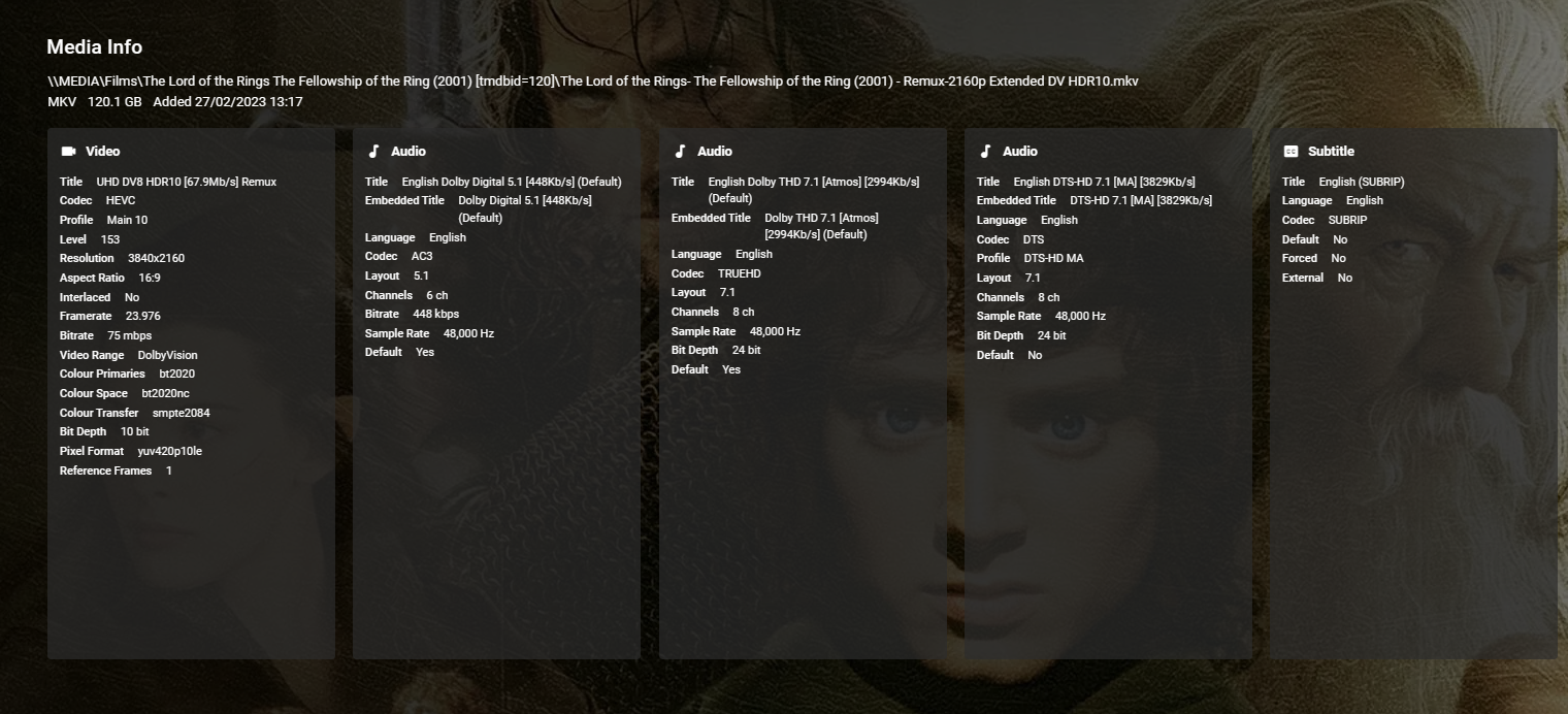 rbjtech 5284 Posted June 20, 2023 Posted June 20, 2023 (edited) 16 minutes ago, Tyson454308 said: EBR, how do I find the bitrate? I am going to try a few new things tonight with the network setup and wire everything together. Then I'll add the mkv file to the desktop so its off of the raid to see if that improves the stuttering. Andrewds, is it better for the file to be transcoded or for it to be supported and directly streamed? In your discussion, it sounds like transcoding eliminates the stuttering. Thanks for the perspective from your setup! use the MediaInfo option in Emby. In my example below - the bitrate is 68Mb/sec (reported as 75 by Emby) This is what's know as a Remux, or uncompressed 4K file. These will only play on certain clients - but I believe the Roku Ultra should play these ok. The issue you may find is actually the HD Audio - the Roku 'may' be transcoding because it needs to convert the HD Audio tracks. We really need a transcoding log (starts with ffmpeg..) to determine why you are having playback issues, but a direct file attached server (your Windows 10 machine with Drivepool) should have zero issues playing these types of file over a wired connection - even via 100Mbit/sec - you may get the occassional pause when your Peak bitrate exceeds the buffer - such as a very intense battle scene for example. HOWEVER - the official Roku 4K max bitrate is actually only 25Mbit/sec .. I use a Shield Pro - so need others who have Roku Ultra's to comment further on this possible limitation. Edited June 20, 2023 by rbjtech