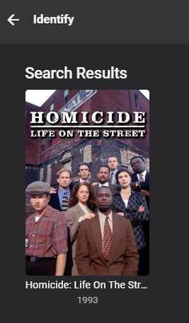 RoyKent 1 Posted August 21, 2023 Posted August 21, 2023 I wanted to add-on to this , as I had the same problems as @RexKwondo. The series in question is "Homicide: Life On The Street (1993)", and it kept pulling metadata from some other series ( ?The Falajweruslka Murders?, something like that), and I couldn't figure it out, and I finally settled on this. 1. I followed the folder structure instructions (Top Level: Homicide Life On The Street (1993) [tvdbid=70727]), and then the subfolders were "Season 1", "Season 2", etc. 2. Then, this is what did it (after all the metadata refreshes kept pulling up the wrong info): Go to metadata manager: Left click on the INCORRECTLY identified series : Go to the upper right of the screen and click on the 3 lateral dots: Choose "Identify": On this screen is where you want to put the (for instance) TVDBID code: for Homicide Life on The Streets its 70727: hit Search (If it doesn't pull the right info, you put in the wrong code) Click on the picture to select the info: Click the box to replace all images if you want, then "OK" at the bottom, then the big info screen pops up: Scroll down to the bottom and, if everything is correct, I'd recommend clicking the "Lock this item to prevent future changes" check box, then "Save" I hope this will help someone in the future! 1
